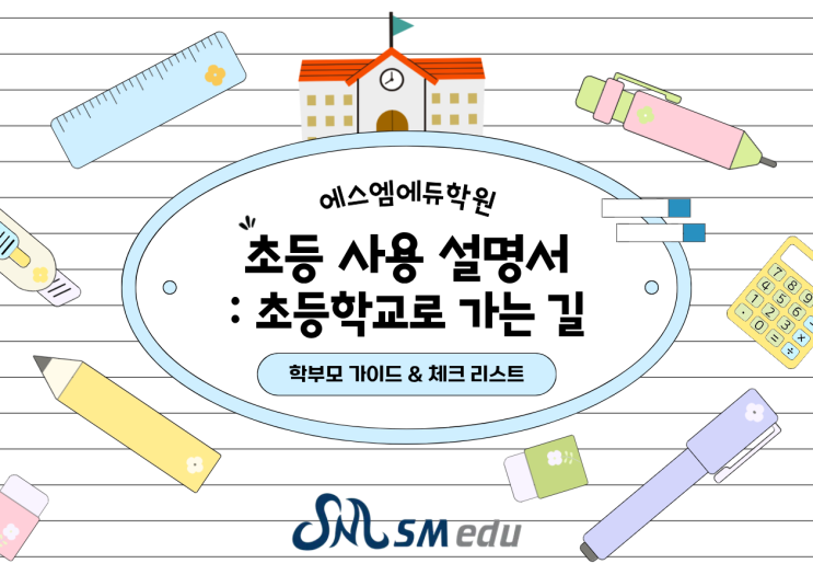 안녕하세요. 에스엠에듀학원입니다. ☺️ 오늘은 2026학년도 초등학교 입학생 학부모님들을 위한 <초등 사용 설명서>를 준비했습니다. 교육자로서 관찰한 초등학교 적응 팁들을 담아 보았으니 예비 초1 자녀를 둔 학부모님들께서는 꼼꼼히 읽어 보시고 도움 받아가시기를 바랍니다. 에스엠에듀학원장 에필로그 초등 입학은 아이들에게도, 학부모님들께도 큰 변화의 순간입니다. 교육현장에서 초등 1학년 아이들을 지도하며 저는 모든 아이가 이 시기를 비슷한 방식으로 겪는다는 것을 보았습니다. 낯선 환경에서 오는 긴장, 사회적 기술이 아직 익숙하지 않은 데서 오는 갈등, 일정한 규칙이 새로워 생기는 혼란, 도움 요청에 익숙하....... <img src="https://blogthumb.pstatic.net/MjAyNjAxMDdfNDYg/MDAxNzY3Nzk2MjIyODEz.TkNDwApAhAArgCk3Vzbo57qJcPYKpfkiQNPC9KsRLVwg.msRyfhiNkI992lrHFOOK51bhtdBGRS-jufEID0Ykcpog.PNG/1.png?type=s3" />