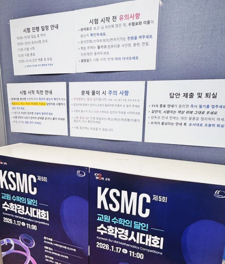 안녕하세요, 수학의 달인 엠케이학원입니다 지난 1월 17일 토요일, 제5회 KSMC 수학경시대회가 전국 여러 지역에서 동시에 진행되며 모든 일정이 무사히 마무리되었습니다. 이번 KSMC 수학경시대회는 한 지역, 한 학원에서만 치르는 시험이 아니라 전국 각지의 학생들이 같은 날, 같은 시간에 동일한 시험으로 실력을 점검한 전국 단위 수학경시대회였습니다. 같은 시간, 다른 지역에서 같은 문제를 두고 집중하고 있는 아이들이 있다는 사실만으로도 이번 대회가 가진 의미는 충분히 크다고 느껴졌습니다. 대회는 실제 시험과 동일한 환경을 경험할 수 있도록 입실 시간부터 고사장 규칙까지 엄격하게 운영되었고, 아이들은 처음에는 긴장....... <img src="https://blogthumb.pstatic.net/MjAyNjAxMjJfMjQw/MDAxNzY5MDkyMjI1OTQ5.uhfF5bAdaEGy6m8r6v95AIGtCsn3aisn9Br1R_gkCdog.ly0sy6DViIJA2_CNRTGFRzQLZup_BrdmNRPIT3oPulUg.JPEG/output%A3%DF2356674511.jpg?type=s3" />