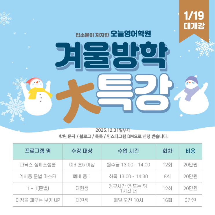 안녕하세요 오늘영어 원장입니다. 겨울방학은 아이의 실력이 가장 빠르게 회복·정리·도약할 수 있는 시기입니다. 오늘영어는 방학마다 많이 하는 수업이 아니라, 지금 꼭 필요한 수업만 준비해 왔습니다. 2026년 겨울 방학 특강 일정을 안내드려요. 1. 파닉스 심폐소생술 1월 19일(월) 개강 월·수·금 13:00 1시간 × 12회 / 20만 원 (교재 포함) 대상 예비 초5 이상 (현 초4부터) 수업 성격 고학년 읽기 회복 집중 과정 이런 학생에게 추천합니다 학원을 옮길 때마다 “파닉스가 안 돼요”라는 말을 듣는 경우 단어를 장기적으로 외우기 위해, 한 번은 구조를 짚고 넘어가고 싶은 경우 긴 파닉스 과정에 지친 고학년 알파벳 조합만으로 외우는 단....... <img src="https://blogthumb.pstatic.net/MjAyNTEyMzFfMTM4/MDAxNzY3MTQ5ODQ5MTUx.kB1gjKwCpglzIMwHFYnhq18I4cHTFQ2ZaJD1DePRhNIg.B_qe6l7vMfhr3Cb0MX5HAuDgaDHMT6_ULQRgM5tnq7Ug.PNG/%B0%DC%BF%EF%B9%E6%C7%D0_%C6%AF%B0%AD.png?type=s3" />