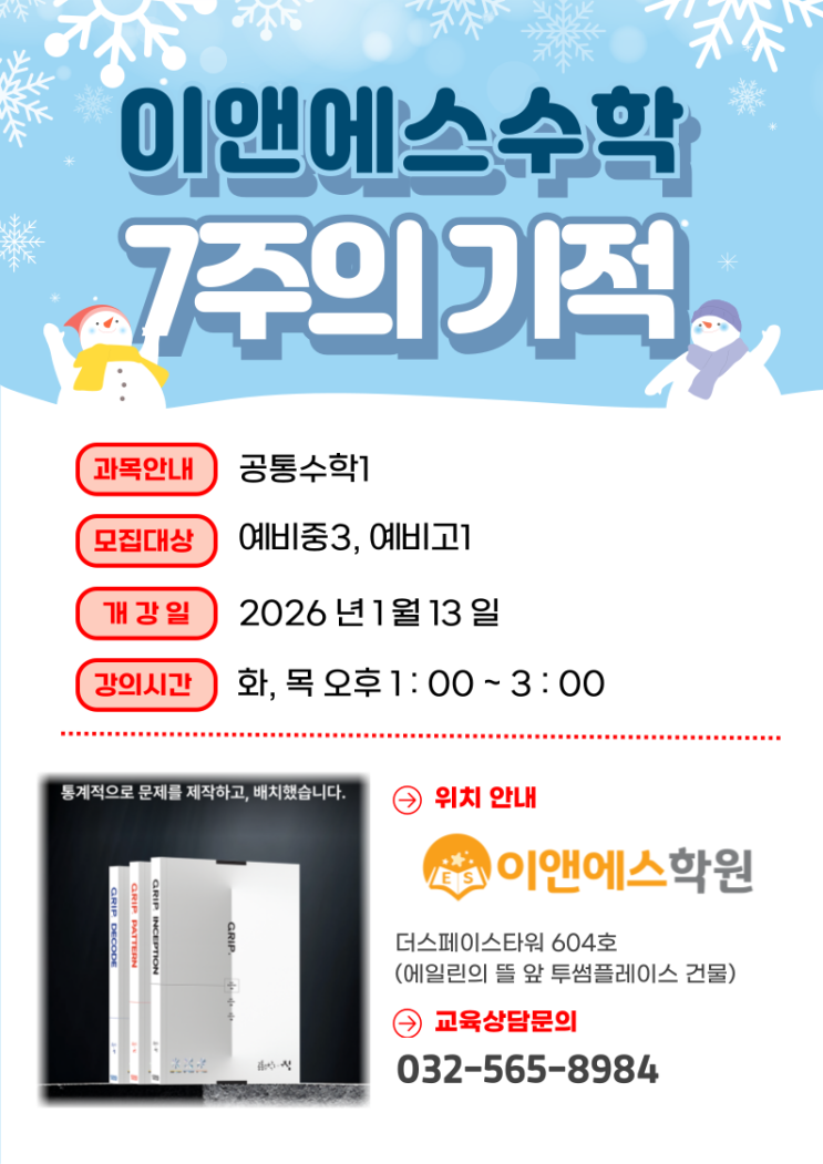 2026. 청라 수학 겨울방학 특강안내 (중등부) - 뻔하지 않은 특별한 교재 GRIP 공통수학1