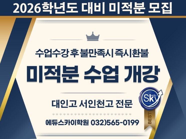 예비고3 미적분 수업을 개강합니다 이미 서인천고/대인고 선배들이 실력과 성적으로 증명한 강의 입니다 개념서/유형서/수능특강/모의고사 등으로 수업이 진행될 예정입니다 자세한 사항은 032 565 0199로 연락 바랍니다 <img src="https://blogthumb.pstatic.net/MjAyNjAxMDRfMjEz/MDAxNzY3NTE4NTkyOTgz.fMC3UwlBZIqEXQUQp6fwtzzr1z-0og6c0hDvbvEq_40g.fk-EpxrrXdXu52TQ4WhAHib4p2R_a7GyOrkK3KJWyVQg.JPEG/900%A3%DF1767150216191.jpg?type=s3" />