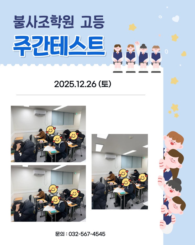 안녕하세요 중고등 입시학원 불사조 학원입니다. 12월26일(토) 진행한 고등부 주간테스트 입니다. 불사조학생들 이번주에도 열심히 테스트를 보고 있어요 학생들도 열심히 공부 할 수있게 불사조도 함께 할게요 #가좌동학원 #가좌고입시학원 #가좌동입시학원 #서구입시학원 #가좌동중등학원 #가림고학원 #가좌고학원 #가좌동중등학원 #가좌동중등영어 #가좌동중등수학 #가좌동국어 #가좌동고등국어 #가좌동고등수학 #가림고 #가좌고 #삼산동입시학원 #삼산동학원 #삼산고 #산남고 #삼산중 #산남중 #삼산동중등영어 #삼산동중등수학 #삼산동고등수학 #부평입시학원 #삼산동고등영어 #불사조학원 <img src="https://blogthumb.pstatic.net/MjAyNjAxMDhfMjgg/MDAxNzY3ODU1ODEyODY3.nyp-vJdBZvfDtneI0778UbGATqDLPBgMhqNUtYSgaegg.x-1D0pXNUmP1KpCwsska19cajRgNH09q3eU_Wuc5xRog.JPEG/1.jpg?type=s3" />