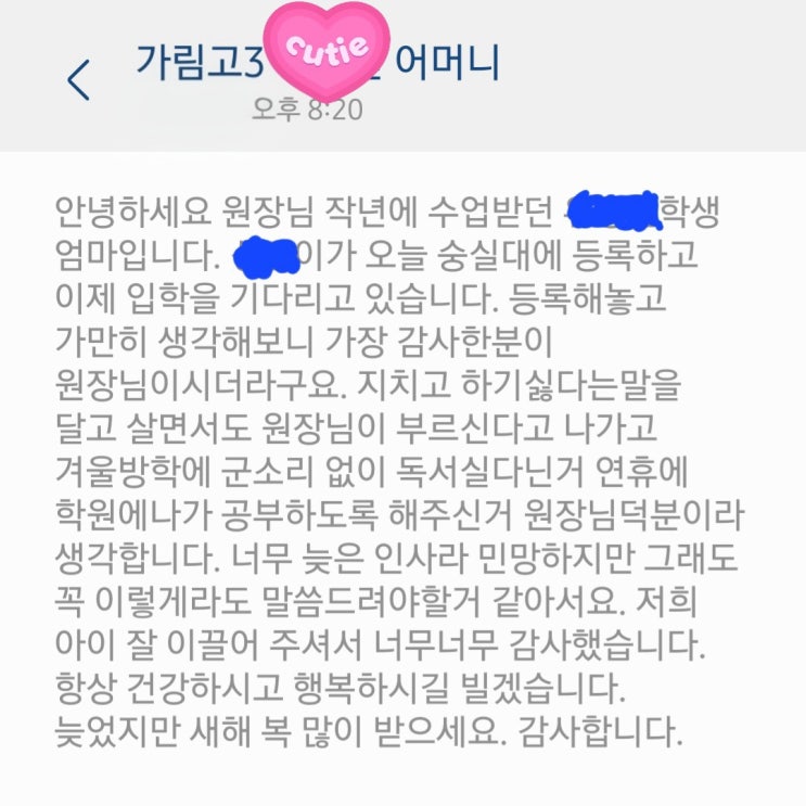 #청라영어학원#청라학원 #청라어바웃영어 #어바웃영어 #청라중등학원 #청라고등영어 #청라수시 #청라정시#청라수능영어#청라중등영어# 무거운 책임감을 가지고 학생들을 가르쳐오며 보람도 느끼지만 저도 사람인지라 힘듦이 없지만은 않습니다. 좀 처럼 풀리지 않는 상황도 있고, 학생의 노력이 생각만큼의 결과가 뒤따라와 주지 못할 경우, 때론 좌절감을 맛보기도 합니다. 하지만 이런 저런 여건 속에서도 저의 노력을 지켜봐주시고 알아주시는 분들이 있기에 다시 기운내서 수업준비를 하고, 누구보다 잘 가르치려 노력하고 좋은 성과를 낼수 있도록 최선을 다하고 있습니다. 이제 2026년, 새해가 밝았으니, 새로운 마음가짐으로 다시 열심히....... <img src="https://blogthumb.pstatic.net/MjAyNjAxMDhfNiAg/MDAxNzY3ODQ3OTk1OTYz.-Ypgj-9KIKgtiAGJjYRVL3xqzAcajxkAJuljNG_FZT8g.8yXCi_oyI-XFYa1bpL26AacdB8gTH793wjokaSH9Rg8g.JPEG/KakaoTalk_20260108_135100713.jpg?type=s3" />