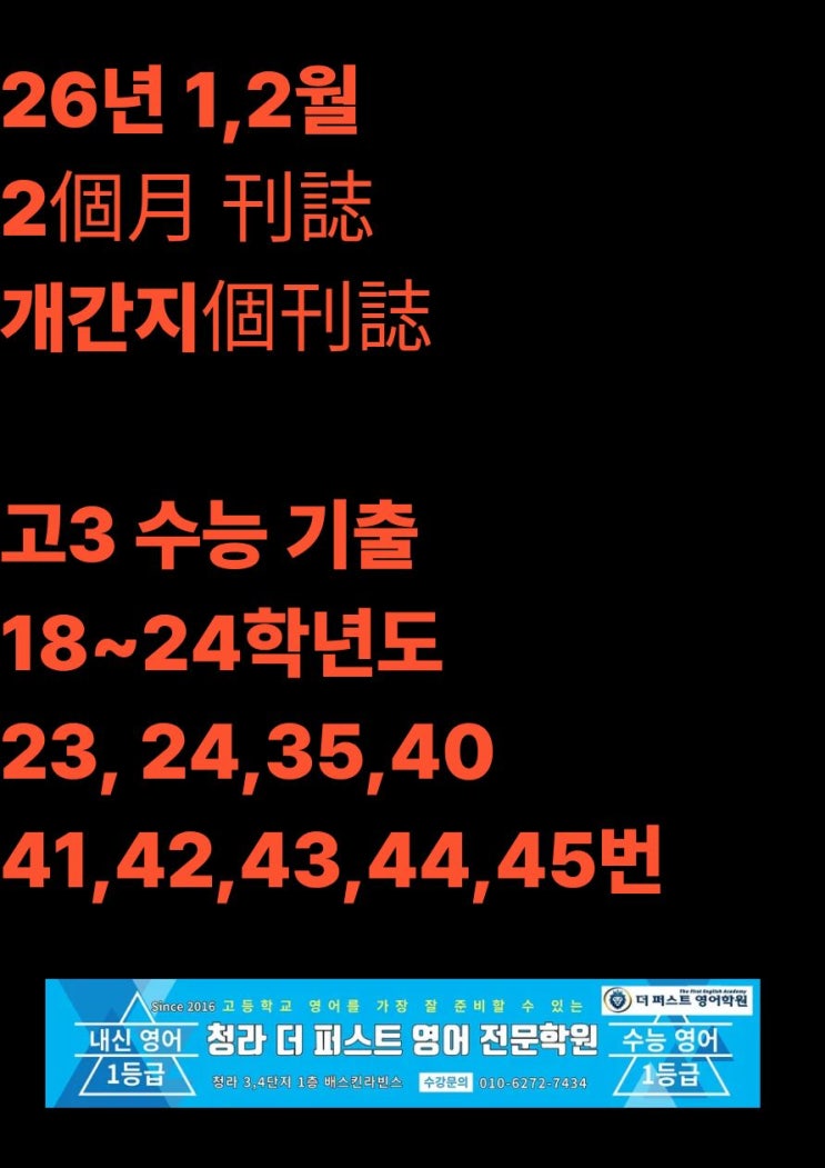 안녕하세요.^^ 청라 3,4단지 루비타워 (1층 배스킨라빈스 7층) Since 2016 더 퍼스트 영어 전문학원입니다. 저희 원은 매년 수능 보는 원장 직강 소수 정예 중1부터 고3 정시대비까지 수업합니다. 26년 1학기 고등학교 3학년 내신 영어 대비 및 27학년도 수능 정시대비로 이어지는 고3 정규반 운영 중입니다. 금/토 반으로 운영이고 금요일 8시 20분~ 10시 30분 토요일 3시 30분~5시 40분 입니다. 26년 1월, 2월 부단히 공부하여 3월 모의고사에서 작은 성과를 내고 1학기 중간고사, 기말고사 수능까지 인내하며 공부에 임하면 되겠습니다. 주어진 과업에 인내하며 충실히 임하는것은 앞으로 인생을 살며 겪게되는 어려움을 이겨내는데 큰 밑거름....... <img src="https://blogthumb.pstatic.net/MjAyNjAxMTBfOCAg/MDAxNzY4MDM3NTc5MjQ1.b-BL-mYM0bnuDoCeobGzlpjJ-ryGKxRDcqpL7GDeHIkg.k-NFTUZrDMGAPggV6v1hKqoIF3eeGArTQdrTC3_E_t4g.JPEG/%C1%A6%B8%F1%C0%BB_%C0%D4%B7%C2%C7%D8%C1%D6%BC%BC%BF%E4_%2815%29.jpg?type=s3" />