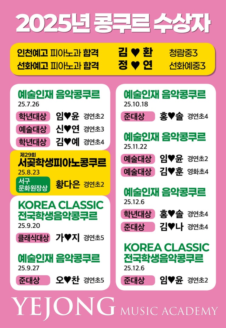 [청라6단지 피아노] 청라음악학원 선택, 결과로 증명합니다 / 2025 콩쿠르 수상자 명단