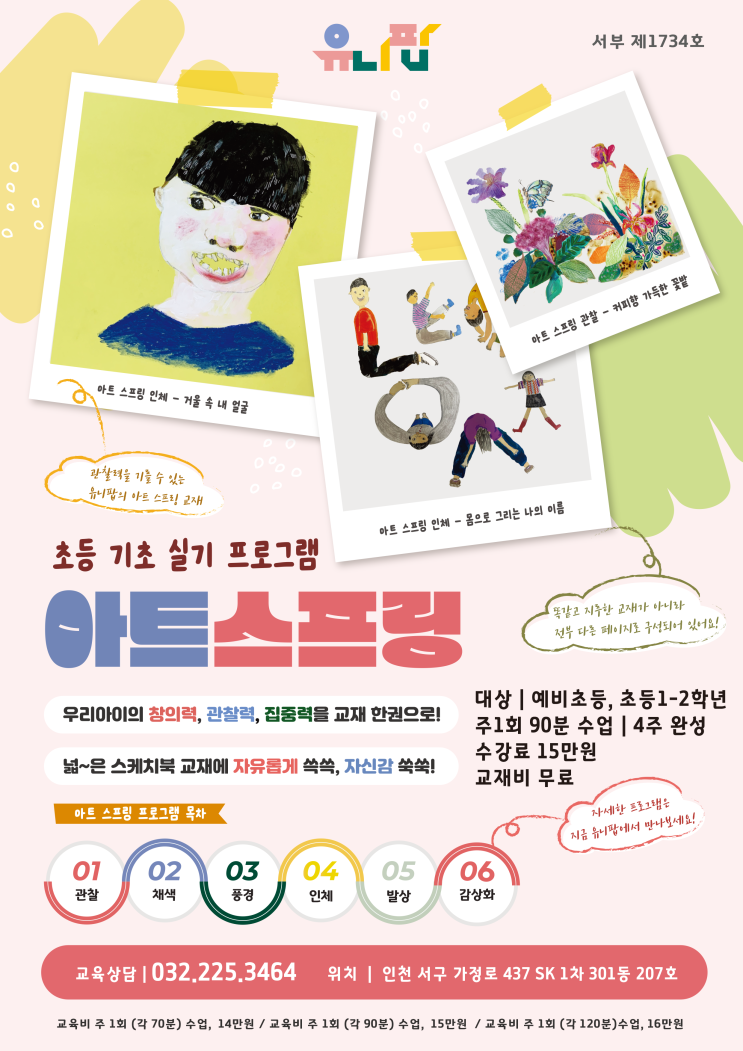 루원시티 유니팝미술학원|예비초등·초1-2 ‘아트스프링’ 4주 완성 프로그램 안내 초등학교 입학을 앞두거나(예비초), 이제 막 학교생활을 시작한 초등 1~2학년 시기는 “잘 그리기”보다 관찰하고 표현하는 힘을 차근차근 만드는 게 중요하더라고요. 루원시티 유니팝미술학원에서는 초등 기초 실기를 탄탄하게 다질 수 있는 ‘아트스프링(Art Spring)’ 4주 완성 프로그램을 운영합니다. 유니팝_아트스프링 대상: 예비초등, 초등 1~2학년 기간: 4주 완성 수강료: 15만원 교재비: 무료 교육상담: 032-225-3464 이런 아이에게 특히 추천드려요! 입학 전, 미술 기초 습관(관찰-표현-완성)을 잡고 싶은 예비초등 초1~초2 시기, 집중력/표현력/자신....... <img src="https://blogthumb.pstatic.net/MjAyNjAxMTVfNDgg/MDAxNzY4NDgwNDAzNzY5.7E99yyAR4xOHLpb2lKA5Kfczaxk08sRnNx5vAsIxcysg.NSx9aED2BdL-9sOwrtyN4RtI9H6fyTKFelwAdOg4ubEg.PNG/%BE%C6%C6%AE%BD%BA%C7%C1%B8%B5_%C8%AB%BA%B8_%C0%FC%B4%DC%C1%F6_%BC%BE%C5%CD%C1%A6%B0%F8%BF%EB.png?type=s3" />