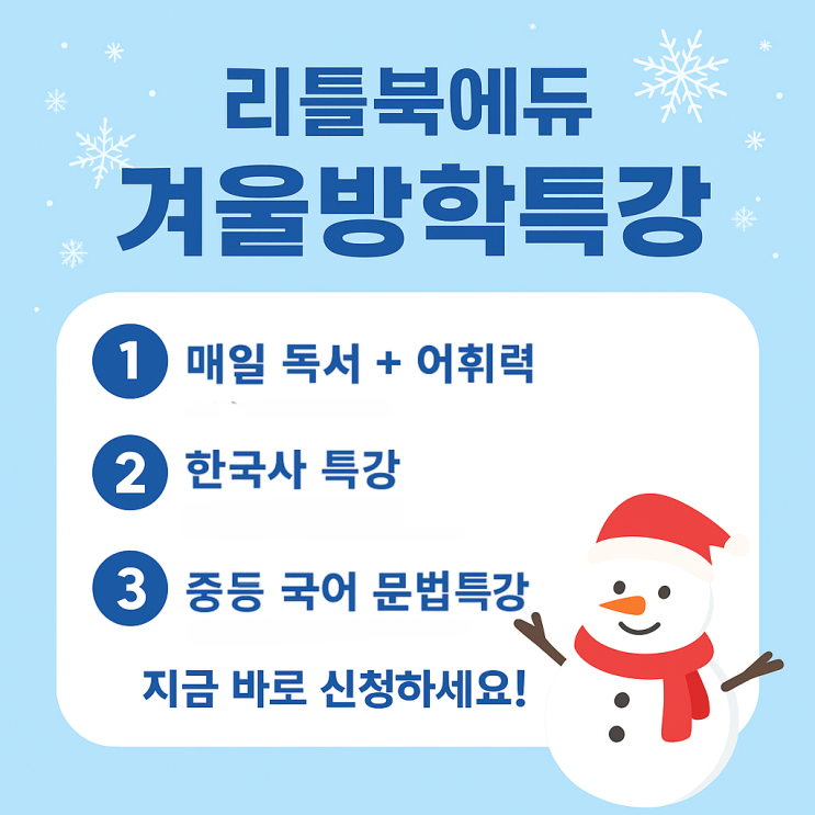 안녕하세요~^^ 신풍초, 풍무초, 풍무중, 양도중 친구들 풍무동 독서논술 국어학원 리틀북에듀입니다. 리틀북에듀 겨울방학특강 안내 겨울방학, 실력을 만드는 결정적 시간 겨울방학은 학기 중에 채우지 못했던 기초를 다지고, 새 학년을 준비할 수 있는 가장 중요한 시기입니다. 특히 국어 실력은 단기간에 만들어지기 어렵기 때문에, 방학 동안의 꾸준한 독서와 체계적인 학습이 무엇보다 중요합니다. 리틀북에듀에서는 이번 겨울방학을 맞아 아이들의 문해력·사고력·표현력을 균형 있게 키울 수 있는 특강 프로그램을 준비했습니다. 1️⃣ 매일 독서 + 어휘력 매일 꾸준한 독서는 국어 실력의 출발점입니다. 하루 60분 동안 진행되는 수업을 통....... <img src="https://blogthumb.pstatic.net/MjAyNTEyMTZfMjc5/MDAxNzY1ODI3MTUyODQz.VEzjEPqL0X7NxoHwl4fG2fLo8hlJQSE19CKVZFN0n7Ag.Gvx0ZwsRbk1DC5HN_zC0KwS9Q8F0vCOqpcqDWGkX5a8g.PNG/%B0%DC%BF%EF%B9%E6%C7%D0%C6%AF%B0%AD_%BE%C8%B3%BB.png?type=s3" />