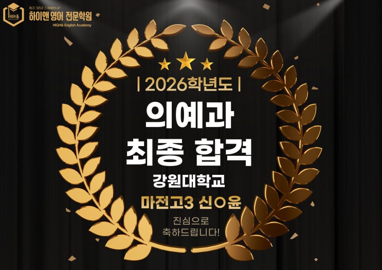 안녕하세요, 하이앤 영어학원입니다 수능이 끝난 지 얼마 지나지 않아 하나둘씩 대입 결과가 전해지고 있는 요즘, 정말 기쁘고 감사한 소식을 전할 수 있어 마음이 벅찹니다. 하이앤에서 고1부터 ~ 고3까지 함께한 마전고 신O윤 학생이 의대 3관왕이라는 값진 결과를 만들어냈습니다. ✨ 의대 3관왕 합격!! 을지대학교 의예과 최종 합격!! 강원대학교 의예과 최종 합격!! 충북대학교 수의예과 최종 합격!! 긴 시간 동안 묵묵히 자기 자리를 지켜온 학생이기에 이 결과가 더 특별하게 느껴집니다. 그동안의 힘든 시간을 잘 견뎌내고 좋은 결과를 얻게 되어 너무 대견하고 누구보다 간절하게 열심히 한 것을 알기에 너무 기쁘고 울컥한 마음입....... <img src="https://blogthumb.pstatic.net/MjAyNjAxMDhfMTIy/MDAxNzY3ODY1Njg3MDkz.icY00_DViDsODBbn6I_K-MTfSyJZRpuP5eWkBVcLFOAg.cYqhRWzPH9PO0_aPUkXszrIexC6JC5OhvNdw8bYqiNQg.JPEG/028.jpg?type=s3" />