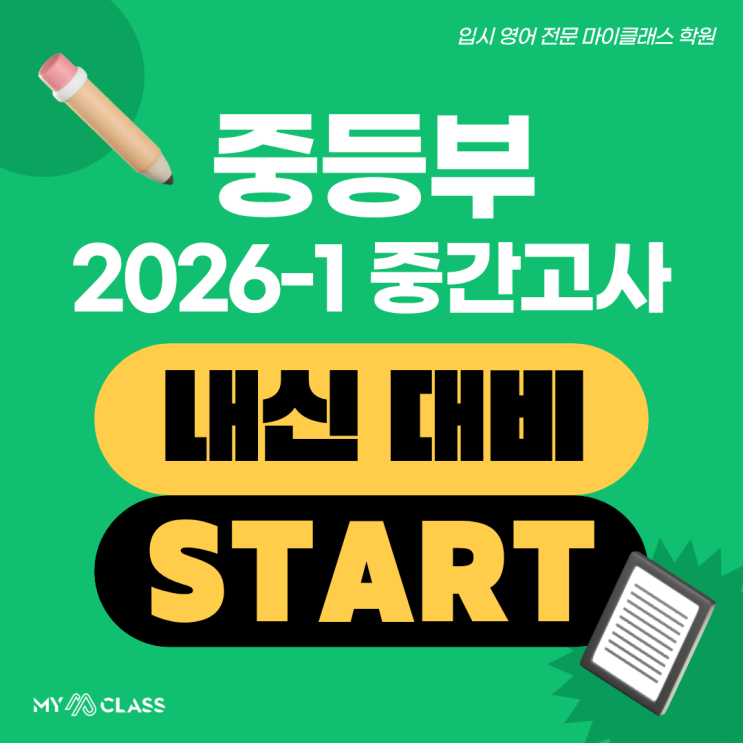 안녕하세요, 입시 영어 전문 마이클래스 학원입니다. 마이클래스는 개원 후 4년 동안 체계적이고 차별화된 커리큘럼을 위해 모든 강사진들이 목동에서부터 연구 · 개발한 자체 제작 교재를 사용하고 있습니다. 그리고 이번 1학기 중간고사를 준비하며, 중등부 교재를 새롭게 리뉴얼 하였습니다. 내신 대비의 결과는 '얼마큼 공부했느냐'보다 '어떻게 공부했느냐'에서 갈린다고 봅니다. 같은 범위를 공부하더라도 어떤 기준으로 문제를 선별하고, 어떤 방식으로 변형을 대응했느냐에 따라 실제 시험에서의 적응력이 달라지기 때문입니다. 마이클래스 중등부는 시중 교재에만 의존하지 않고, 자체 제작 교재를 병행하며 내신 대....... <img src="https://blogthumb.pstatic.net/MjAyNjA0MDNfMTI0/MDAxNzc1MjA5NjYwMjc5.3bb-vjJF5_ULsYDycR6RlAShsaliU48gd-INyUpjXq4g.adU-71nt66JXL-2rjXTlNQke0K_1SzeIk20Z9tCj1Aog.PNG/2026-1_%C1%DF%B5%EE%BA%CE_%C1%DF%B0%A3%B0%ED%BB%E7.png?type=s3" />