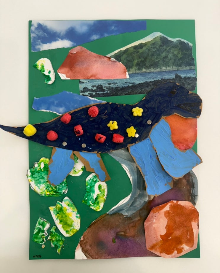 안녕하세요^^ 이번 수업에서는 할핀을 이용해 공룡의 몸을 연결하며 움직임의 원리를 재미있게 알아보았습니다 관절이 움직이는 구조를 직접 만들어 보며 공룡의 몸을 여러 덩어리 형태로 나누어 생각하고 표현해 보았답니다 뚝딱 뚝딱! 나무 망치로 두드리고 있는 것은 무엇일까요~~? “선생님~ 이건 계란 껍질 이잖아요~ㅋㅋ” 계란 껍질 위에 물감을 짜 놓고 망치로 쿵쿵!!! “ 우와~~ 공룡이 걸어다니는 소리 같아요~~!” 물감 껍질을 나무 망치로 두드리며 깨지는 소리와 질감을 느껴 보았습니다 이렇게 신나는 미술 놀이와 함께 콜라주 기법으로 배경을 구성하며 공룡이 살아 움직이는 장면을 완성했습니다:) 오늘도 재료의 특성과 표....... <img src="https://blogthumb.pstatic.net/MjAyNjA0MDRfMjcy/MDAxNzc1MjY1MTIwOTM5.g3n80F9kSZVe5DRFCZ-bVsIwvTTU3mMUg-2PfIlcKEIg.uZzc6V0Tb2hBhpziwN_Rjo2crFzv7hai-L9nbb0DtUcg.JPEG/IMG%A3%DF8012.jpg?type=s3" />