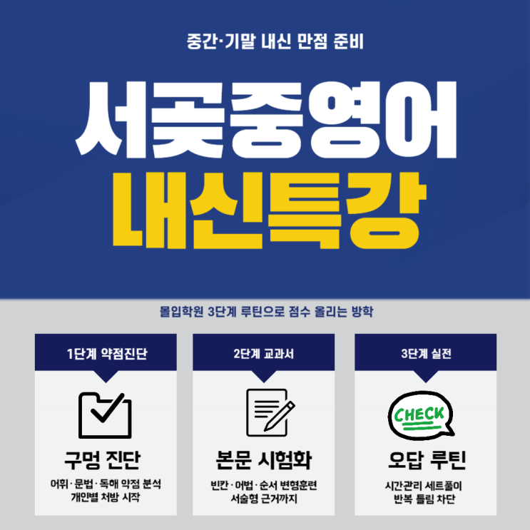 서곶중영어 점수, 방학에 갈립니다: 중간·기말 대비 3단계 루틴 방학이 되면 많은 학부모님이 이렇게 말씀하세요. “이번 방학엔 단어랑 문법만 확실히 시키면 되겠죠?” “학기 중에 바쁘니까 방학에 몰아서 올리면 되지 않을까요?” 그런데 중등영어 내신에서 점수가 오르는 학생들은 ‘공부량’이 많아서가 아니라, 점수로 연결되는 순서를 알고 움직입니다. 방학에 흔히 생기는 실패 패턴이 있어요. 단어는 외웠는데 시험에서 빈칸/어법이 흔들림 문법은 했는데 지문에서 근거를 못 잡아 서술형이 약함 문제집은 많이 풀었는데 오답이 반복됨 즉, 방학 공부가 “열심히”였는데도 점수가 안 오르는 이유는 간단합니다. 내신은 ‘암기’가 아....... <img src="https://blogthumb.pstatic.net/MjAyNjAxMTVfMTg0/MDAxNzY4NDEzODM3Mjgx.sLd2Way6j2cF0JRmAs-wakZyUOdU5Kq5Fn2ynH3_hlAg.Ow0Yxro3ZEq2ggPvEi9tjOlzAU5gnsW5Q92Sxk5z2kgg.PNG/%BF%A5%BA%A3%BD%BA%C6%AE_se%B8%F4%C0%D4%C7%D0%BF%F8_%BA%B9%BB%E7%BA%BB-006.png?type=s3" />