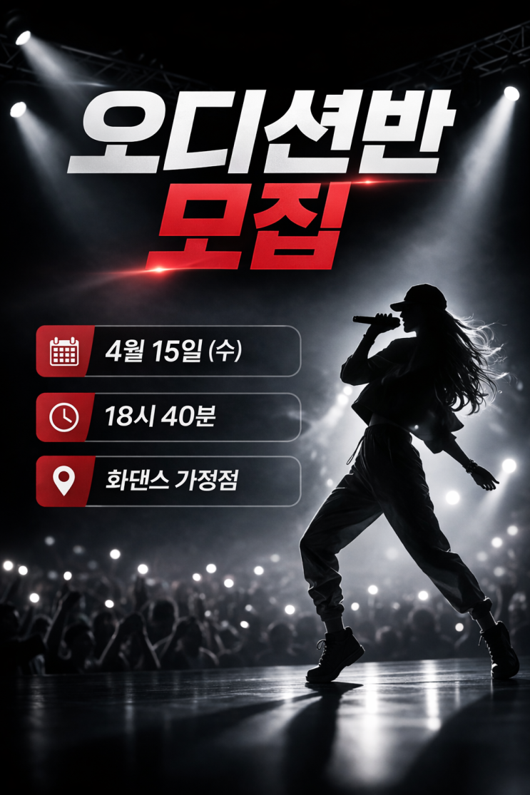 안녕하세요 :) H.W.A 화댄스 가정점입니다! 오디션반 신규 학생 모집 안내 실력으로 성장하고, 무대를 목표로 하는 친구들을 위해 오디션반 모집을 진행합니다. 단순 취미가 아닌, 정확한 트레이닝과 목표를 가지고 실력을 키우고 싶은 분들을 위한 클래스입니다. 오디션 일정 날짜 : 4월 15일 (수) 시간 : 18시 40분 장소 : 화댄스 가정점 오디션 준비사항 자유곡 1분 이내 (장르 자유) ✔️ 트레이닝 내용 K-POP / 코레오 집중 트레이닝 기본기 및 퍼포먼스 강화 대회 및 기획사 오디션 준비 소수정예 집중 케어 이런 분들께 추천드립니다 춤을 진지하게 배우고 싶은 분 실력을 빠르게 성장시키고 싶은 분 오디션 및....... <img src="https://blogthumb.pstatic.net/MjAyNjA0MDNfMTg1/MDAxNzc1MjE1NjQ5OTI0.l3H1sRD_aA_cfJQs1Gisej8FQ30RY89KHgdKJ4eull8g.esyaEgYf3kHyzMkW44MI7tD38_8bISFS3TPDeFxB_hYg.PNG/%BF%C0%B5%F0%BC%C7%B9%DD_%B8%F0%C1%FD_%BE%C8%B3%BB.png?type=s3" />
