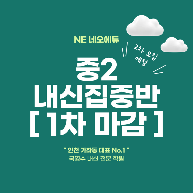 안녕하세요. 가좌동 내신 전문 네오에듀학원입니다 :) 이번 중2 내신 대비반은 감사하게도 많은 관심을 주신 덕분에 1차 모집이 마감되었습니다. 1) 원활한 수업 진행과 학생 한 명, 한 명에 대한 꼼꼼한 관리를 위해 정원을 제한하여 반을 운영하고 있습니다. 2) 단순히 인원을 늘리기보다는 아이들이 수업을 제대로 이해하고, 내신에서 실제 결과로 이어질 수 있도록 집중도 높은 환경을 만드는 것을 더 중요하게 생각합니다. 3) 그래서 기존 반의 정원을 무리하게 늘리지 않을 예정입니다. 다만 현재도 꾸준히 문의를 주시는 학부모님들이 계셔 추가 반 개설(2클래스 운영)을 검토하고 있습니다. 추가 반 역시 - 동일한 커리큘럼 - 동일....... <img src="https://blogthumb.pstatic.net/MjAyNjA0MDdfMTkw/MDAxNzc1NDg4OTY5ODU2.uF2wGFTMHOhPwk_afGKrpgyxHqEgqXAcBWWxk5GwQ6cg.r6WnjHNp48Den2Yoge3k88SgP1uGsG4GuKlVebLF0awg.PNG/%C1%A6%B8%F1%C0%BB_%C0%D4%B7%C2%C7%D8%C1%D6%BC%BC%BF%E4._%283%29.png?type=s3" />