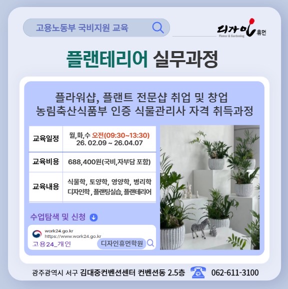 #디자인휴먼_교육부 - 김대중컨벤션센터2.5층 #국비지원교육 #플랜테리어실무과정 다음 주 월요일 개강 그린인테리어, 플랜테리어 디자이너가 되고 싶으신가요? '플랜테리어'는 플랜트+인테리어의 합성어로, 자연친화적이면서 내츄럴함이 꾸준한 관심사인 요즘, 곳곳에 소품으로 식물이나 화분으로 포인트를 주는 인테리어를 말합니다. . . 국가에서 지원하는 내일배움카드제도를 활용하여 교육비 지원도 받으면서, 창업 아이템으로 각광받는 플렌테리어에 대한 공부를 해보시는건 어떠실까요~? . . 이곳은 플로리스트&가드너 꿈터 디자인휴먼 - 교육부, 사업부 #꽃과_사람들의_이야기 ᄀ....... <img src="https://blogthumb.pstatic.net/MjAyNjAyMDVfMTM3/MDAxNzcwMjYwNzUxMjM4.C_JdvgU2g4DJN1yJqFOGZebA1D6f2h1C_7ALrJ61goUg.zioxxEEmh9madMzZ3ovdNdMyf-umshPsa1HKAuCtSogg.JPEG/BandPhoto%A3%DF2026%A3%DF02%A3%DF05%A3%DF10%A3%DF38%A3%DF56%A3%DF1.jpg?type=s3" />