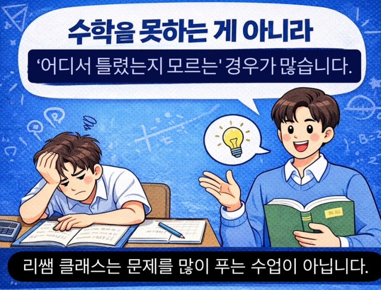 학원을 몇 번 바꿔도 아이의 수학 성적이 크게 달라지지 않는 경우가 많습니다. 부모 입장에서는 “우리 아이가 의지가 부족한가?” “수학 머리가 없는 건가?” 이런 고민까지 하게 됩니다. 하지만 현장에서 오랫동안 아이들을 지도해보면 대부분의 경우 원인은 따로 있습니다. 수학을 못하는 게 아니라 ‘어디서부터 틀렸는지 모르는’ 상태로 진도만 계속 밀려왔기 때문입니다. ◆ 학원에서 자주 생기는 문제 학원 수업은 정해진 진도가 있습니다. 이해가 완벽하지 않아도 다음 단원으로 넘어갈 수밖에 없는 구조입니다. 질문을 잘하는 아이는 따라가지만, 조금만 놓쳐도 그 뒤부터는 문제를 외워서 풀거나 찍는 방식으로 버티게 됩니다. 이 과....... <img src="https://blogthumb.pstatic.net/MjAyNjAyMDZfMjE2/MDAxNzcwMzc5NTQzODI2.e9E9EP12tMb_92R2Hn1UaaI4dQRtugEDprYBWZE_dlYg.nFzZop0o5Zk50yKH4js45npBL9tqzLKXBt3kloKC8R8g.JPEG/IMG%A3%DF3420.jpg?type=s3" />