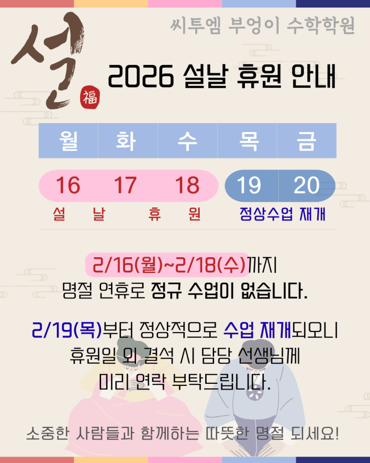 안녕하세요:) 광주 광산구 수완지구 사고력수학 씨투엠 부엉이 수학학원입니다 2026년 설날 휴원 안내드립니다 2/16(월)~2/18(수)까지 명절 연휴로 정규 수업이 없습니다 2/19(목)부터 정상적으로 수업 재개되오니 휴원일 외 결석 시 미리 연락 부탁드립니다 소중한 사람들과 함께하는 따뜻한 명절 보내세요! 우리 사랑하는 부엉이들! 복 많이 받자~♥ <img src="https://blogthumb.pstatic.net/MjAyNjAxMzBfMTc1/MDAxNzY5NzcyOTcwNzk2.tePD2QWsIwVTRv7cV-n7Qr50BK4Na-7KkGLPXVjDt18g.SjxsMExiY_qWe_bODNLXv44-zdPRjh-J8sXLybdL5NMg.PNG/2026_%BC%B3%B3%AF_%C8%DE%BF%F8_%BE%C8%B3%BB.png?type=s3" />