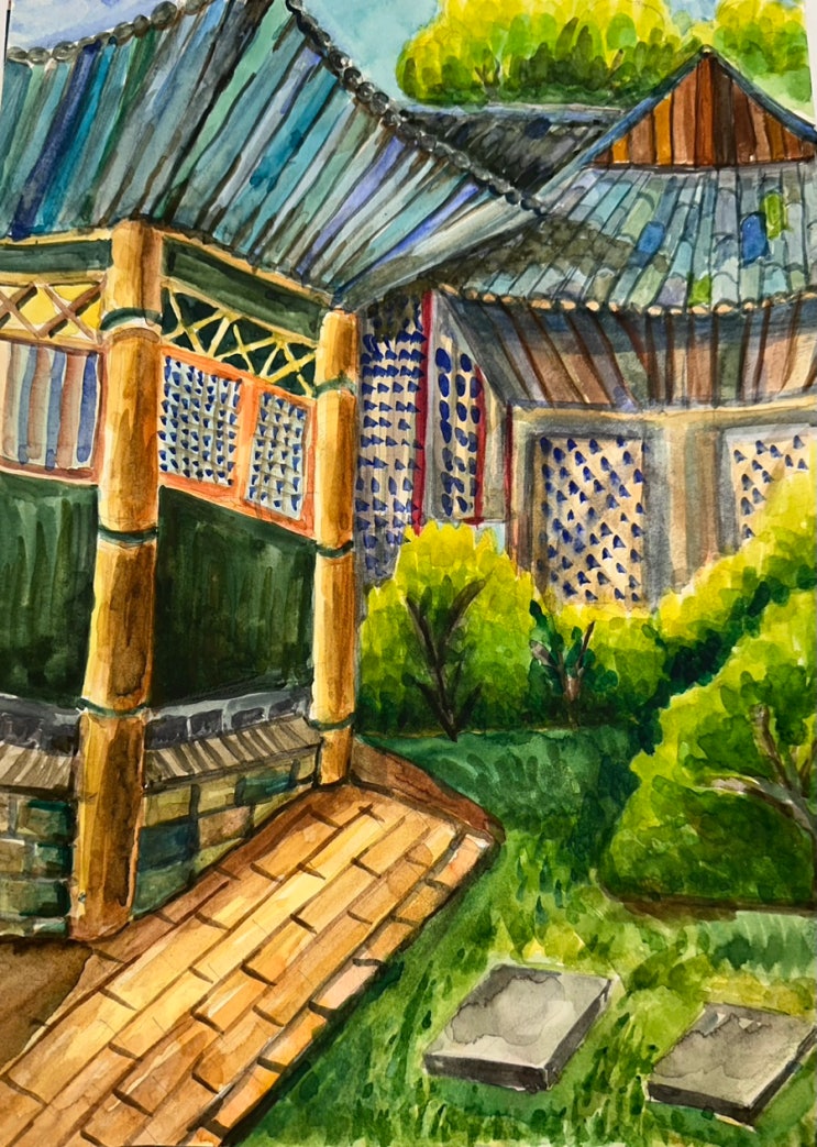 처음엔 다들 이렇게 시작해요!! “어떻게 그려요?” 아이들이 가장 먼저 하는 질문이에요. 아트앤하트에선 이 질문에 바로 답하지 않아요. 대신 이렇게 물어요. ”지금 뭐가 보이니“? 그 질문 하나가 모든 걸 바꿔요. 오늘은 초등 고학년 작품을 소개합니다~^^ 한 아이는 고궁의 빛을 쫓았어요. 청록빛 기와 위로 내려앉은 햇살, 황금빛 기둥이래 고요하게 고인 그늘 이 아이의 붓은 건물이 아니라 빛이 머무는 자리를 따라 움직였어요. 한 아이는 하늘 위로 시선을 올렸어요. 파란 지붕 주황 건물 초록으로 넘실대는 나무들 또 한 아이는 숲속으로 걸어 들어갔어요. 황톳빛과 초록이 뒤엉킨 나무 사이, 빛의 파편들이 흩어지는 그 안쪽으로....... <img src="https://blogthumb.pstatic.net/MjAyNjAzMjBfNDkg/MDAxNzc0MDEzOTIwNzEw.6vVgmdFkbUHigSQaCMUJ5bY6tMsM8UlpRziI66wtnlUg.1PCEe1a8s0TjrCSppco52f3sKAXX5RXkTEJkF0gfAEwg.JPEG/IMG%A3%DF1346.jpg?type=s3" />