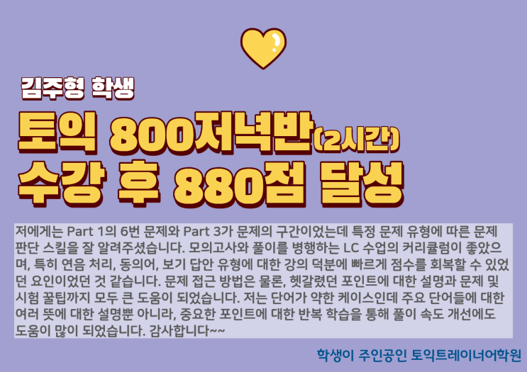 오늘은 토익트레이너에서 문제 유형에 따른 풀이 스킬과 꼼꼼하고 반복적인 설명을 통해 목표점수에 도달한 김주형 학생의 후기를 알아보아요~! 1. 800반 LC 후기 LC의 경우 직전 시험에서 좋은 성적을 거둠과 자신 있는 영역이라고 생각했지만 문제가 어려워지고 오랜만에 하다보니 첫 듣기 수업에서 처참한 결과를 보였습니다. 저에게는 Part 1의 6번 문제와 Part 3가 문제의 구간이었는데 특정 문제 유형에 따른 문제 판단 스킬을 잘 알려주셨습니다. 모의고사와 풀이를 병행하는 LC 수업의 커리큘럼이 좋았으며, 특히 연음 처리, 동의어, 보기 답안 유형에 대한 강의 덕분에 빠르게 점수를 회복할 수 있었던 요인이었던 것 같습니다. 2. 800반....... <img src="https://blogthumb.pstatic.net/MjAyNjAxMTJfMzgg/MDAxNzY4MjEyNzE4NDQy.fG2f5eE_xhXZO2GyXVinJOwkduMbwtpR69oBublHh5gg.cvQ7idFc7c3_8Q4j45tVc01tlJrG8EcH8LmzZ7oeD6Eg.PNG/%B1%E8%C1%D6%C7%FC.png?type=s3" />