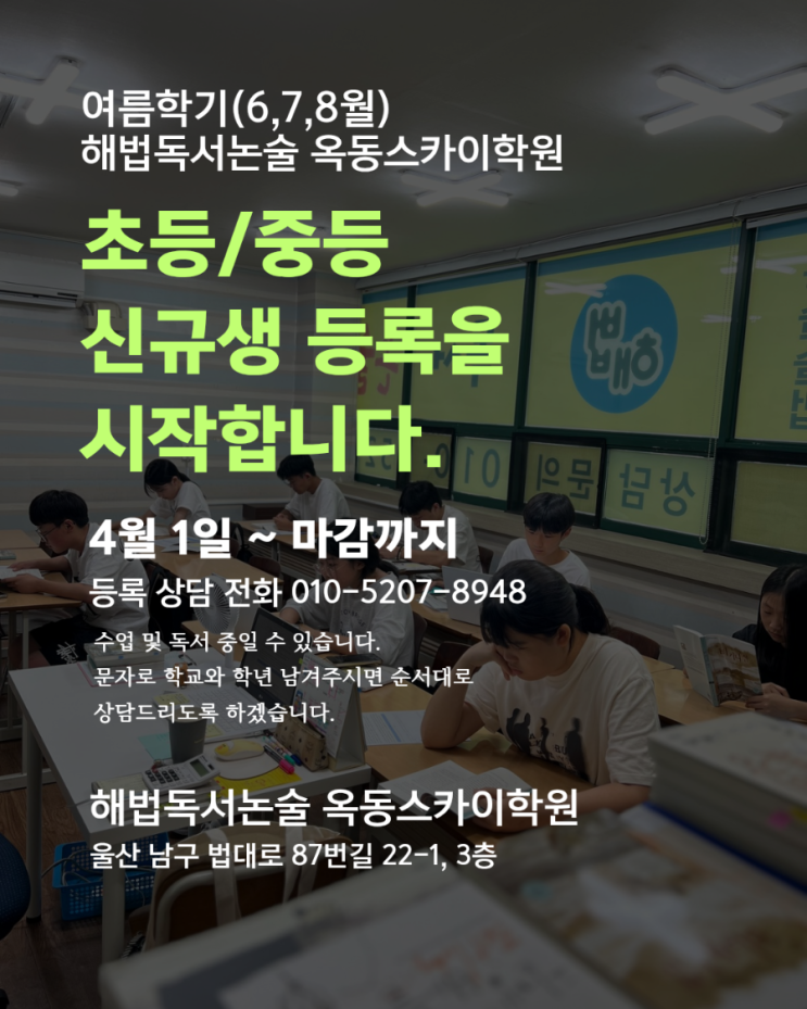 해법독서논술 옥동스카이학원 여름학기 초등/중등 신규등록 상담을 시작합니다. 해법독서논술 옥동스카이학원 초등/중등 여름학기 등록 안내문 교습비 안내 타임테이블 안내 강사 프로필 : 손경엽 원장 초/중등 신규생 여름학기 등록을 시작합니다. 4월 1일부터 마감까지 신규 등록을 받습니다. 상담은 문자로 신청해 주세요. 010-5207-8948 ※재원생(재등록)을 우선으로 하기에 반별 등록 가능생은 모두 다르며, 신규 티오가 있는 반부터 등록을 받습니다. 노쇼의 이유로 대기는 사양합니다. 수능 3월 모의고사 이후 또 한 차례의 소나기같은 고등상담을 치렀습니다. 국어영역의 독서 및 고전시가 문항을 비롯해 대부분의 지문들이 최상위....... <img src="https://blogthumb.pstatic.net/MjAyNjA0MDFfMTA4/MDAxNzc1MDA0MDMzOTQ0.elUUXk4nOGSbCj2qFlg4rcjh_d3OQaZsVjttMB7ps5sg.8asmye50KnSEsct9GM6xDP-M7Zj9aFE7UeX5t56W2Owg.PNG/900%A3%DF%BF%A9%B8%A7%C7%D0%B1%E2_%B5%EE%B7%CF%BB%F3%B4%E3%C0%BB_%BD%C3%C0%DB%C7%D5%B4%CF%B4%D9.%A3%DF20260401%A3%DF082746%A3%DF0000.png?type=s3" />