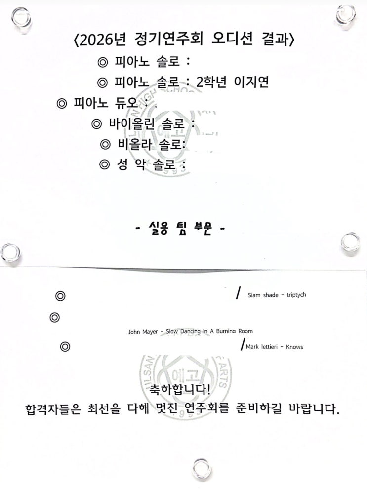 해냈어요 !!!!!!! ♥ "쌤!!!!! 저 정기연주회 붙었어요 !!!!!!!!!!" 우리 지연이, 정기연주회 오디션 합격 했어요 !!!!!!!!!!!! 전 학년이 지원해서 경쟁률도 생각보다 높았을 텐데 정말 너무 대견하고 자랑스러워요 ㅠ.ㅠ 초등부 시절부터 유독 눈에 띄던 아이였고, 주변에서도 큰 기대를 받던 유망주 지연이. 하지만 아이들은 시간이 흐르고 스스로에 대한 생각이 많아질수록 오히려 무대를 더 무서워하게 되는 경우가 많아요. 지연이 역시 그런 과정을 지나고 있었고, 그래서 이번 오디션은 단순한 합격 그 이상으로 큰 의미가 있는 도전이었습니다. 저는 늘 아이들에게 이야기해요. 무대 공포를 이겨내는 방법은 결국 '무대를....... <img src="https://blogthumb.pstatic.net/MjAyNjAzMjlfNzUg/MDAxNzc0Nzg1MTkwMzM2.gwiY_nZ7m6-g7EVDJfsYDfNjFEauWuDNMH1WEEZ_IEkg.8RrbV3ZQze8vpKZbExMiSif5DqOoo6pCCLV6kIZXlAgg.JPEG/KakaoTalk_20260329_205228417.jpg?type=s3" />