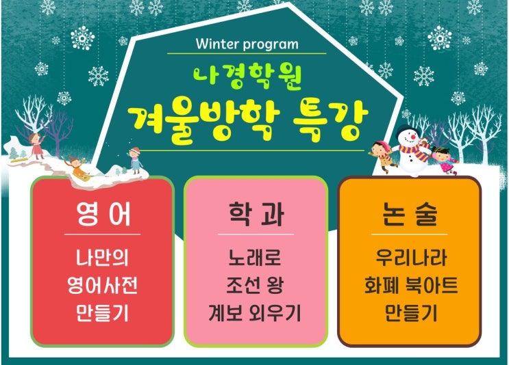 나경학원 겨울방학 특강 안내 Winter Program 나경학원에서는 겨울방학을 맞아 아이들의 학습 흥미 + 기초 실력을 키우는 겨울방학 특강 프로그램을 진행합니다. ✏️ 프로그램 구성 영어 나만의 영어사전 만들기 → 단어 이해력 · 표현력 강화 학과 노래로 조선 왕 계보 외우기 → 역사 흐름을 재미있게 이해 논술 우리나라 화폐 북아트 만들기 → 사고력 · 표현력 · 배경지식 확장 프로그램 특징 겨울방학 동안 재미있게 배우는 융합형 수업 만들기 · 노래 · 활동 중심 수업으로 집중력 향상 초등 눈높이에 맞춘 체험형 학습 학과, 영어, 논술부에서 각각 준비한 특강으로 알찬 내용이 듬뿍 담겨있어요 곧 겨울 방....... <img src="https://blogthumb.pstatic.net/MjAyNjAxMjBfMjg0/MDAxNzY4ODU5Mjc2NTA5.NZpHxAF-4eOgvdbxzJBogxQsgYnjLIjVEBSpeQlxt58g.SLWNzz4QmGDts_ZqVKnqxSU6ZVRxbv2yajayRm6Bs70g.JPEG/j_f58Ud018svc10ot0dkgrq14e_ea6zo5.jpg?type=s3" />