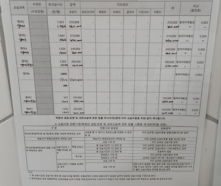 교습비 안내