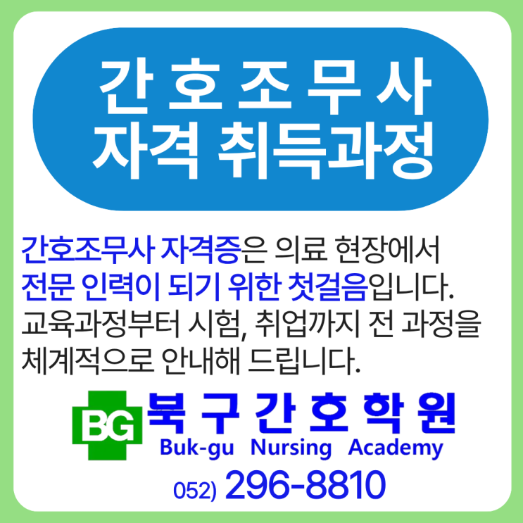 간호조무사 자격 취득과정에서 취업 연계지원까지 알아보기 울산 북구에서 간호조무사 준비하고 계신다면, 북구간호학원에서 든든하게 시작해 보세요. 친절하고 정확한 상담부터 자격증 취득, 취업까지 한 번에 ! 간호조무사 준비, 전문가가 도와드리겠습니다. 간호조무사 자격 취득과정 간호조무사 자격 취득, 올바른 첫걸음. 교육과정부터 국가시험, 취업까지 전체 과정을 알려드릴게요. 간호조무사의 역할과 전망 간호조무사는 병원, 의원, 요양시설 등 어디서든 간호조무사는 꼭 필요한 의료 인력이에요. 간호사 업무 보조, 환자 케어, 의료 기구 관리 등으로 의료현장에서 든든한 조력자 역할을 하고 있습니다. 의료 산업이 꾸준히 성장하면....... <img src="https://blogthumb.pstatic.net/MjAyNjAxMjBfOTkg/MDAxNzY4OTAzNDExNjU5.aymLTWt-aRHlh47sjOeouFPAcIdtIXmcSPqdjHdbx9Ig.ufcINCQGXXFOCGdzkqD9vZpVMjOGJFot59rDKNh5teIg.PNG/%BF%EF%BB%EA_%BA%CF%B1%B8%B0%A3%C8%A3%C7%D0%BF%F8_%B0%A3%C8%A3%C1%B6%B9%AB%BB%E7.png?type=s3" />