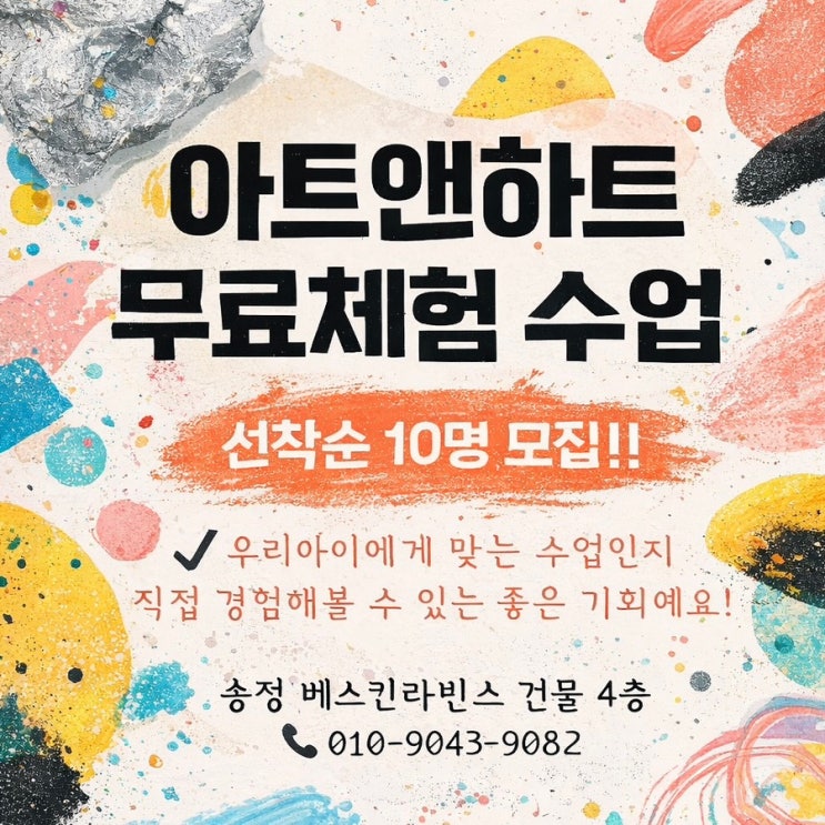 2026 신학기 아트앤하트 미술학원 원생 모집 안내 ✔️선착순 무료체험 수업 진행중 안녕하세요 아이들과 함께 행복한 미술수업을 하고 있는 아트앤하트 송정 미술학원입니다. 1월 무료체험 수업 선착순 모집과 2026년 신학기 시간표 조정 및 확정으로 유치부 · 초등부 신규 원생 모집 안내드려요 체험수업 신청 시 아래 내용을 작성해서 남겨주시면 확인 후 개별 연락드리겠습니다 [체험수업 신청 양식] 1️⃣ 아이 이름 / 나이 2️⃣ 어머니 성함 3️⃣ 연락처 4️⃣ 미술 경험 유무 (있음 / 없음) 5️⃣ 가능하신 시간대 010-9043-9082 ———————————— ✨ 수업 안내 ✔ 유치부 (4세 ~ 7세) • 연령별 맞춤....... <img src="https://blogthumb.pstatic.net/MjAyNjAxMTlfMjQy/MDAxNzY4ODMyMjg3NTc0.PKtHVevRqzC0WrgwGrZ3IBvkvZOiHXyiZ94RZ2ZCG3kg.tKsIRUzeBzdG4Va45kRfYfL-4mVreAn6BSKc0fU0wTYg.JPEG/C826CAD6%A3%ADF919%A3%AD4283%A3%AD9B1F%A3%ADD913056F020A.jpg?type=s3" />