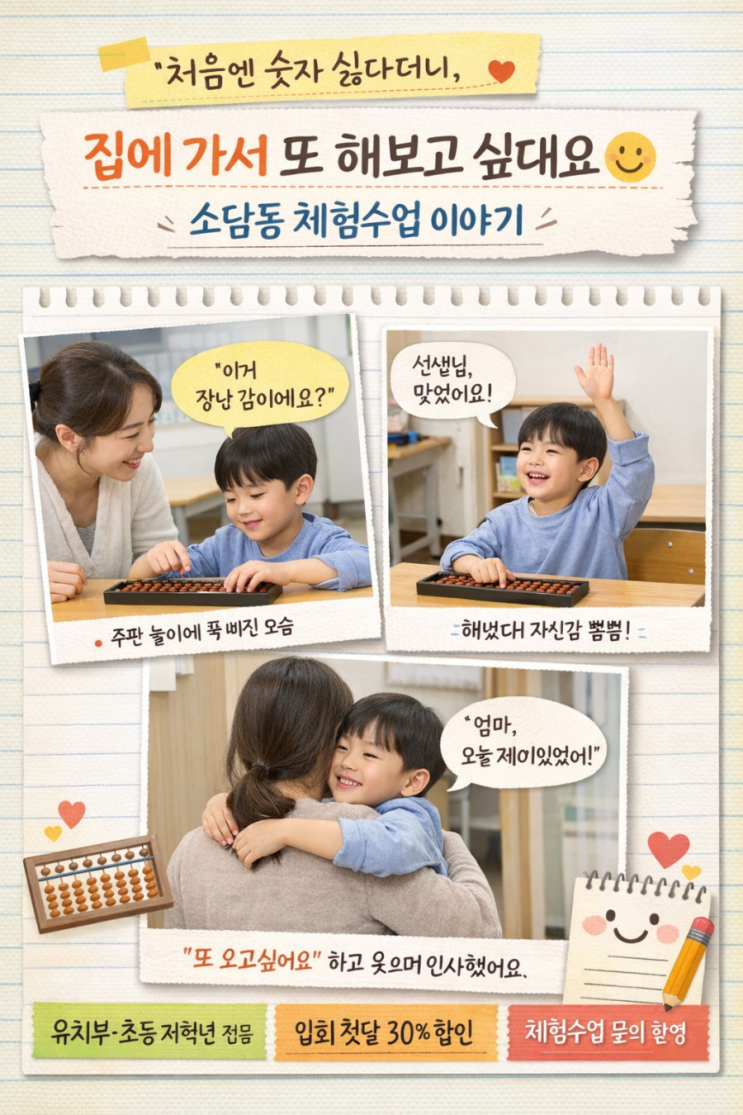 며칠 전, 소담동에 사는 초등 1학년 아이가 주산식암산 체험수업을 다녀갔어요. 체험 전 어머님 말씀은 이랬습니다. “계산은 하는데 실수가 많고, 문제 풀 때마다 한숨부터 쉬어요.” 처음 교실에 들어올 때도 아이 얼굴엔 긴장한 기색이 조금 있었어요. “이거 장난감이에요?” 주판을 처음 본 아이의 첫 마디였습니다. 딱딱한 문제부터 시작하지 않고 손으로 직접 움직이고, 눈으로 보며 숫자를 느끼는 활동부터 진행했어요. 몇 분 지나자 아이는 자연스럽게 주판을 만지며 계산 과정을 따라오기 시작했습니다. “선생님, 이거 이렇게 하면 더 빨라요?” 조심스럽게 묻던 모습이 아직도 기억에 남아요. 체험수업이 끝난 뒤 수업이 끝나고 어머....... <img src="https://blogthumb.pstatic.net/MjAyNjAyMDNfNTEg/MDAxNzcwMTI3ODY5MDAz.hBAZynpcwj5biw-Vt0dGJc3Qc5kGGyFO0GqpXCKmZCwg.dViqL1A_larb-rKD3u51AKhomFHSrtJnMCTPSwUonuwg.PNG/900%A3%DFfile%A3%DF0000000032c471faab810ae0cf9c35ba.png?type=s3" />