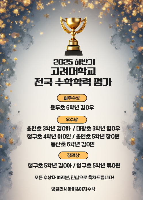 안녕하세요~! 신당동 수학학원 잉글리시아이&이지수학 입니다! 지난 11월, 2025 하반기 고려대학교 전국 수학학력평가에서 우리 아이들, 값진 결과를 만들어냈습니다. 이번 대회는 단순히 문제를 많이 풀어본다고 해서 좋은 결과를 얻기 어려운 시험으로, 개념 이해력, 문제 해석 능력, 제한된 시간 안에서의 사고력과 집중력이 모두 요구되는 경시대회입니다. 그만큼 아이들에게도, 지도하는 입장에서도 의미가 큰 시험이었습니다. 결과보다 더 값졌던 준비과정~! 사실 이번 대회를 준비하며 가장 중요하게 생각했던 부분은 '상' 그 자체보다도 과정을 통해 아이들이 얼마나 성장했는가였습니다. 어려운 문제를 끝까지 포기하지 않....... <img src="https://blogthumb.pstatic.net/MjAyNjAyMDZfMTE0/MDAxNzcwMzU5NjY5NDI4.3AjNA9kyYNWX1Kq5JTJq0HkBoMnxtQbaXwp9F4UGzg8g.YQaHQJItCefrDEYRUxFsSuvpsRQQKBnHace95l9YLhog.PNG/%C8%AD%B8%E9_%C4%B8%C3%B3_2026-02-06_153407.png?type=s3" />