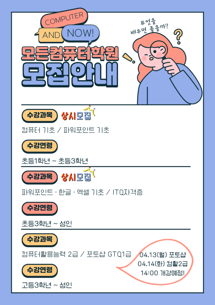 안녕하세요 모든컴퓨터학원입니다. 요즘 부모님들 사이에서 “컴퓨터 언제부터 배우는 게 좋을까요?” 라는 질문 정말 많이 듣습니다 정답은 빠를수록 좋다! (하지만 제대로 배우는 게 더 중요합니다) 세종 소담동 모든컴퓨터학원에서는 아이부터 성인까지 수준에 맞는 맞춤 수업을 진행하고 있습니다. ✔ 컴퓨터 완전 처음인 초등학생 ✔ 학교 과제 때문에 필요한 친구들 ✔ 자격증 준비하는 중고등/성인 모두 수강 가능해요! [현재 모집 중인 수업] ✔ 컴퓨터 기초 / 파워포인트 기초 초등 1학년 ~ 초등 3학년 ✔ 파워포인트 · 한글 · 엑셀 기초 / ITQ 자격증 초등 3학년 ~ 성인 ✔ 컴퓨터활용능력 2급 / GTQ 자격증 고등학생 ~ 성인....... <img src="https://blogthumb.pstatic.net/MjAyNjA0MDFfMTkx/MDAxNzc1MDA1OTUxNDcy.Qg_ZE0-tePFFmrfhzlSYH0-VNsg4Dw-4mcVD7D8-ny0g.LbE_5PdknPuwQ8mUdaudZI5uRQ5RQuaSfV-WcbkuiCgg.PNG/세종컴퓨터학원.png?type=s3" />