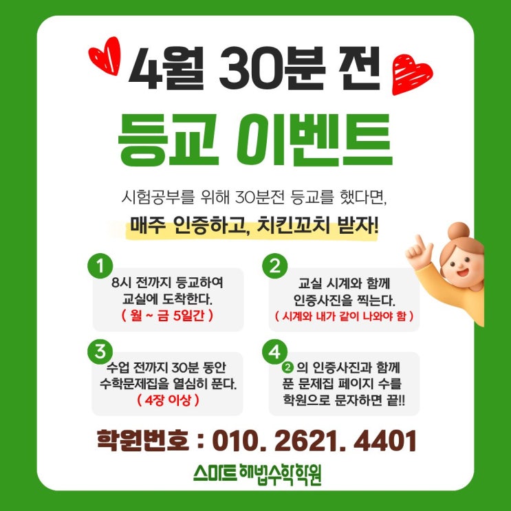 4월, 진짜 실력이 만들어지는 시간 4월은 단순한 한 달이 아닙니다. 우리 아이들의 **시험 결과를 좌우하는 ‘핵심 준비 기간’**입니다. 특히 중간고사를 앞둔 시기인 만큼, 이 시기를 어떻게 보내느냐에 따라 성적의 방향이 완전히 달라질 수 있습니다. 그래서 스마트해법수학학원은 4월을 “집중·몰입·습관”의 달로 정하고 조금 더 ‘빡세게’, 하지만 ‘확실하게’ 준비합니다. ⏰ 30분이 만드는 성적의 차이 “하루 30분이 뭐가 달라요?” 이 질문에 저희는 자신 있게 말씀드립니다. 매일 30분이 모이면 결과는 완전히 달라집니다. ✔ 30분 일찍 등원 ✔ 수업 전 문제풀이 4장 이상 ✔ 매일 인증하며 습관화 이 작은 루틴이 쌓이....... <img src="https://blogthumb.pstatic.net/MjAyNjAzMjdfMTQg/MDAxNzc0NjIxNzEwOTIx.XuSh1OeU-MK6LggbkYkhmSqCmIlENDZgIlgPp4qBmLkg.esyvhaU6oi-6eC96WabTVgsR8N_Z5kkj9sG8nHrGuQ4g.JPEG/1.jpg?type=s3" />