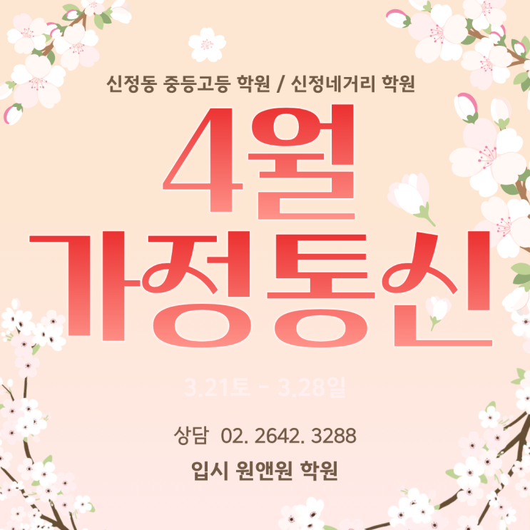 학부모님, 안녕하십니까. 어느덧 교정 곳곳에 벚꽃이 피어나는 따뜻한 4월이 다가왔습니다. 지난 3월이 우리 아이들에게 새로운 환경과 친구들에 적응하는 워밍업의 시간이었다면, 4월은 본격적인 학업의 궤도에 오르며 실력을 단단하게 다져야 하는 가장 중요한 시기입니다. 중등.고등 완벽한 1학기 중간고사 대비 기간 중등·고등부 학생들에게 4월은 새 학년의 첫 시험인 중간고사가 있는 달입니다. 첫 시험의 결과는 한 해의 학습 자신감을 좌우할 만큼 중요합니다. 지난 26년간 수많은 학생들의 내신과 입시를 이끌어 온 신정동중등고등 학원 ,신정네거리 학원 입시원앤원 학원은 각 학교별 기출 문제와 출제 경향을 예리하게 분석하여 빈틈....... <img src="https://blogthumb.pstatic.net/MjAyNjAzMzFfMjgy/MDAxNzc0OTM4Njk2ODUx.m_k9wi64Wxa_w7dn7e8_uamiTYX6wFU8uQvoJWXUt4gg.OhZb9GFsuTONvOcABfnWsWAjD5OAiQYRZpyO0uGUvt0g.PNG/%C1%A6%B8%F1%C0%BB_%C0%D4%B7%C2%C7%D8%C1%D6%BC%BC%BF%E4._-_2026-03-31T153127.291.png?type=s3" />