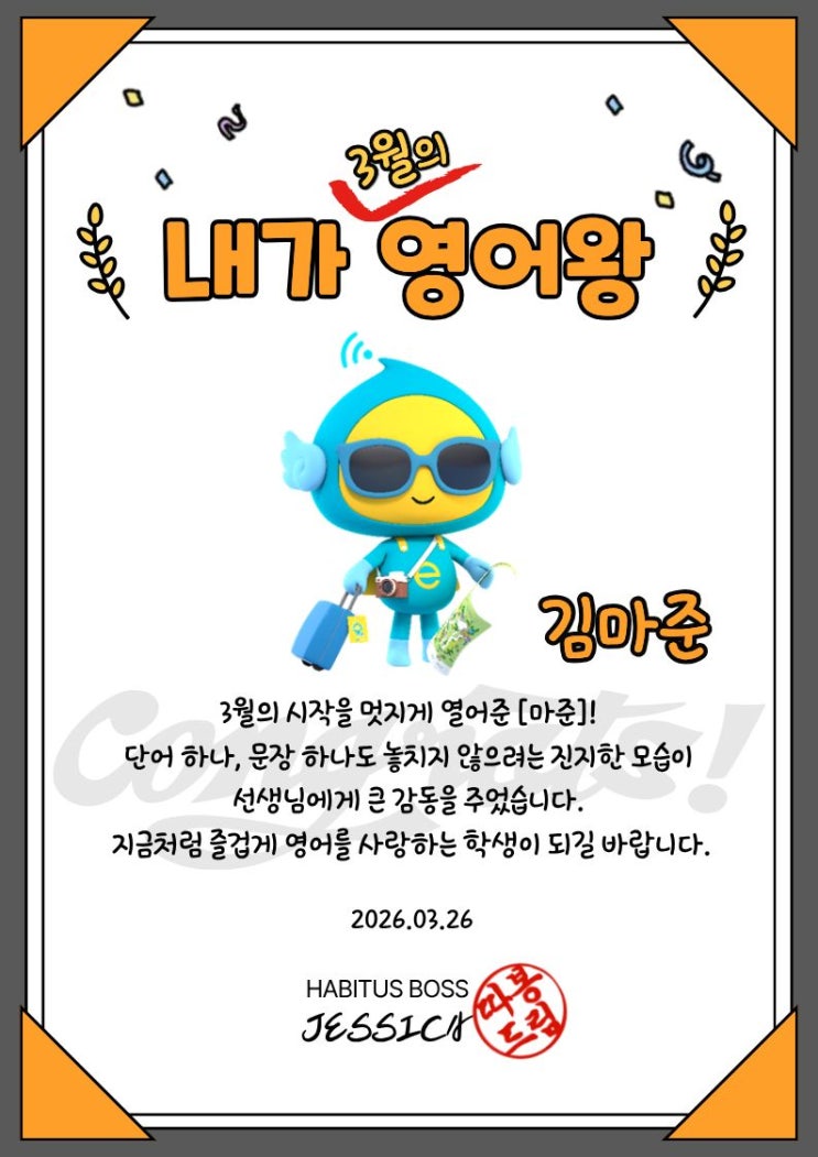 안녕하세요 소담동 아비투스 영어학원 원장 열정뽐뿌 제시카쌤입니다 오늘은 우리 초등부 친구들과 함께한 기분 좋은 소식을 전해보려고 해요. 3월 한 달 동안 수업에 성실하게 참여하고, 영어를 즐겁게 배우며, 자기 자리에서 꾸준히 노력해준 친구들에게 “3월의 내가 영어왕” 상장을 전달했습니다. 3월은 시작이 정말 중요한 달이에요 새 학기가 시작되는 3월은 아이들에게도 참 중요한 시기입니다. 새로운 반, 새로운 친구들, 새로운 공부 흐름에 적응해야 하니까요. 그래서 3월을 어떻게 시작하느냐가 한 학기의 분위기를 만들기도 합니다. 이번 3월, 우리 아비투스 영어학원 초등부 친구들은 생각보다 더 멋진 모습으로 수업에 참여해주었....... <img src="https://blogthumb.pstatic.net/MjAyNjAzMjdfMTU1/MDAxNzc0NTQ4Mjk4MTgz.7GJp9R-vs-RVJGKhguWqTpnnwNpJ71jq01TDIyC6WPcg.6Ba5r8X0FWzcOtb7yzVZaNZIH3dKz7-N5uSvZa_5FOQg.JPEG/KakaoTalk_20260325_135842651.jpg?type=s3" />