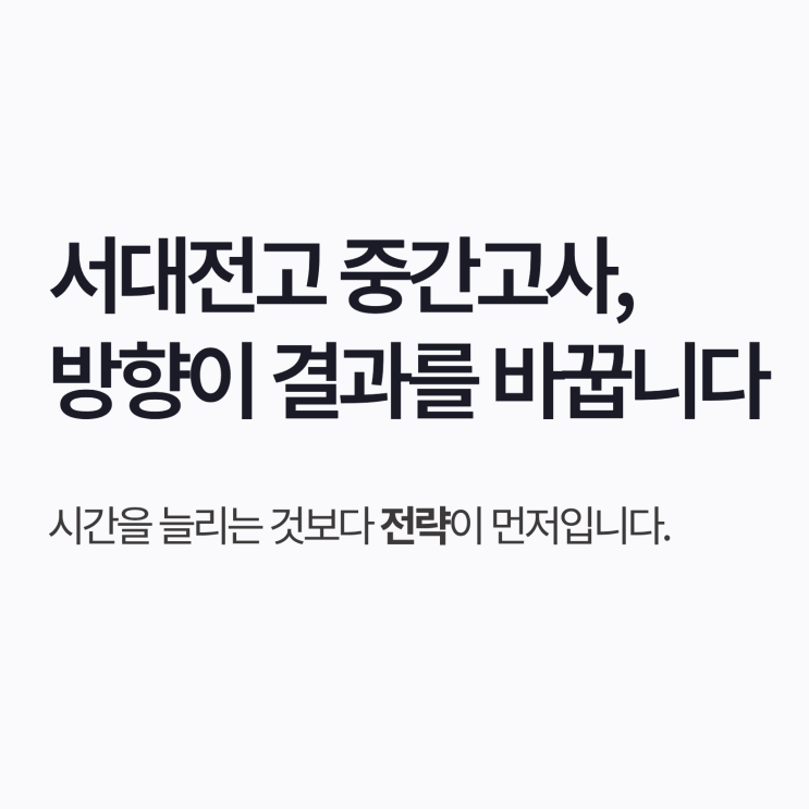 서대전고등학교 중간고사가 코앞으로 다가왔습니다. 이 시기에는 누구나 불안해지고, 공부량을 늘려야 한다는 압박을 느끼게 됩니다. 하지만 단순히 시간을 늘린다고 해서 성적이 오르는 것은 아닙니다. 중요한 것은 방향입니다. 지금까지 해왔던 방식이 효과가 없었다면, 같은 방법을 반복하는 것은 오히려 시간을 낭비하게 됩니다. 서대전고등학교 시험은 범위와 유형이 비교적 명확하기 때문에, 지금 시점에서 전략을 다시 잡는 것이 매우 중요합니다. 제대로 된 방향 설정이 결과를 바꿉니다. 성적이 오르지 않는 이유는 모두 다릅니다 서대전고등학교 학생들을 지도하다 보면, 같은 시간을 공부해도 결과가 다른 이유가 분명히 존재합니다. ....... <img src="https://blogthumb.pstatic.net/MjAyNjA0MDZfNzkg/MDAxNzc1NDY4MDA1MTQ2.vhCJ8EI5nDOrT5BXLx5DT8S8ovL-BkWqvMF0UIf_3TEg.14gn8VbGyGCCtOFYn-cjdqRIBN5MIs5TDm70mahMBsog.PNG/image.png?type=s3" />