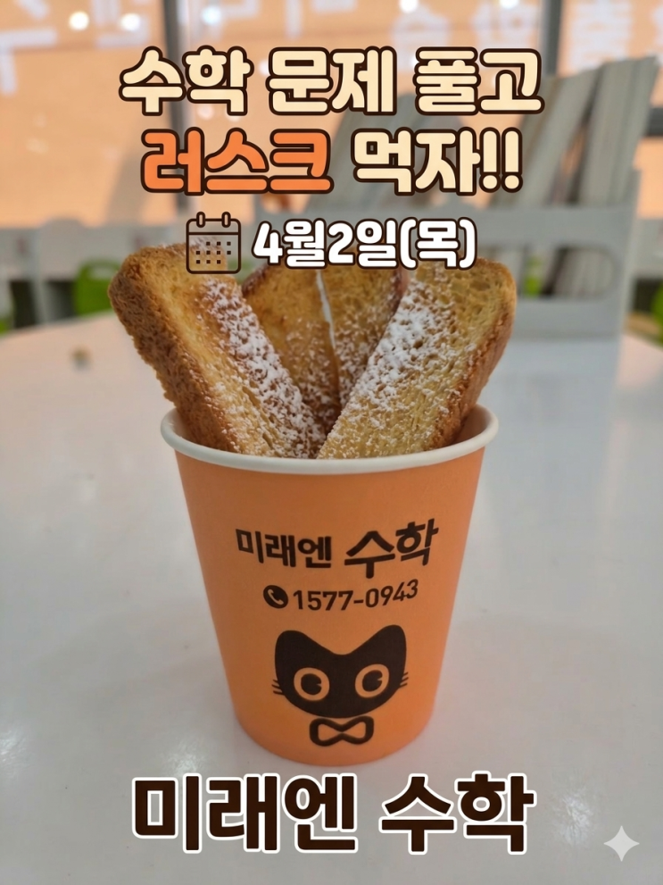 [미래엔 수학] 신학기 적응하느라 애쓴 우리 아이들을 위한 달콤한 선물! 안녕하세요! 미래엔 수학입니다. 어느덧 파릇파릇한 새순이 돋아나는 4월이 찾아왔습니다. 3월 한 달, 새로운 환경과 교실에서 적응하느라 우리 아이들 정말 고생 많았죠? 긴장된 마음으로 가방을 메고 나섰을 아이들을 생각하면 기특하기도 하고 대견한 마음뿐입니다. 그래서 저희 미래엔 수학에서 작은 응원 이벤트를 준비했습니다! ✍️ 수학 문제 풀고! 바삭한 러스크 먹자! 열심히 머리 써서 문제를 풀고 난 뒤 밀려오는 출출함! 그럴 때 생각나는 달콤하고 바삭한 러스크를 준비했어요. 슈가 파우더가 솔솔 뿌려진 달달한 러스크로 아이들의 스트레스를 날....... <img src="https://blogthumb.pstatic.net/MjAyNjA0MDJfMTk3/MDAxNzc1MTMzMTg4ODg0.Q5FJCDPE6QLcCmVuhF1R7EO-Yt4q3VYf0V0CDIRCoiog.esopH3toSATzsK4QUv2Wsucln7eNCDECfnAyy_JSiAsg.PNG/1775103873617.png?type=s3" />