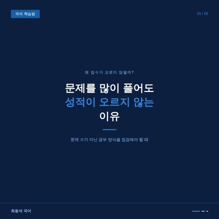 국어 공부를 열심히 하는 학생들을 보면 공통적으로 하는 말들이 있습니다. “문제는 많이 푸는데 점수가 안 올라요.” 실제로 문제집도 꾸준히 풀고 모의고사도 여러 번 보는데 성적이 제자리인 경우가 적지 않습니다. 그렇다면 왜 이런 일이 생길까요? 결론부터 말씀드리면, 문제 수는 성적을 올리는 핵심이 아니기 때문입니다. 문제를 푸는 것과 이해하는 것은 다릅니다 많은 학생들이 문제를 풀 때 정답을 맞히는 것에만 집중합니다. 맞으면 넘어가고 틀리면 해설을 보고 “아 그렇구나” 하고 끝내는 경우가 많습니다. 하지만 국어에서 중요한 것은 정답 여부가 아니라 ✔ 왜 맞았는지 ✔ 왜 틀렸는지 ✔ 어떤 근거로 선택지를 판단했....... <img src="https://blogthumb.pstatic.net/MjAyNjAzMzBfMjg0/MDAxNzc0ODcwMDQ4NjIz.xsRXbNqY9pAbR0faDZl61fmsfdiacsdkRZ2OMknGtZog.pmkApDuPXkEYXI4ihgFtQZCYUNbIeoq6gTP6iyURbhog.JPEG/KakaoTalk_20260330_202250858.jpg?type=s3" />