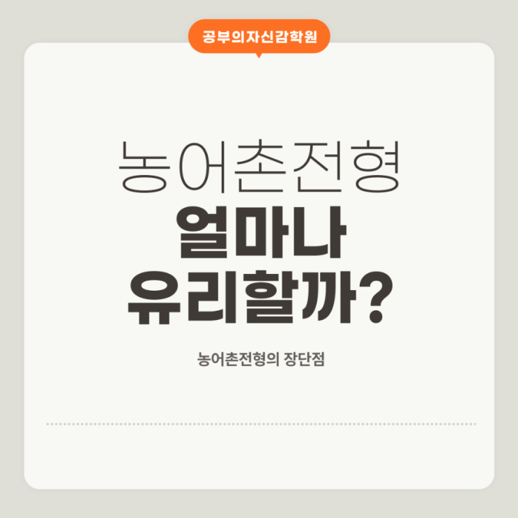 대입 역전의 기회? 농어촌전형의 유리함과 필수 체크리스트 안녕하세요! 공부의 자신감 학원입니다. 자녀의 대입 전략을 세우다 보면 한 번쯤 고민하게 되는 주제가 바로 농어촌전형 입니다. 농어촌 지방으로 이사를 가면 정말 대학 가기가 쉬울까? 라는 질문을 많이 하시는데요. 오늘은 농어촌전형이 실제로 얼마나 유리한지, 그리고 주의할 점은 무엇인지 핵심만 짚어드리겠습니다. 1. 농어촌전형, 왜 유리할까요? 농어촌전형은 읍·면 지역에 거주하며 해당 지역 학교를 다닌 학생들을 대상으로 하는 정원 외 특별전형입니다. 일반전형과 비교했을 때 다음과 같은 확실한 강점이 있습니다. ✅️낮은 경쟁률과 합격선: 지원 자격 자체가 제한적....... <img src="https://blogthumb.pstatic.net/MjAyNjAzMzFfNzUg/MDAxNzc0OTIyNzUwNTA2.7UqlPh3S5IM8N7nWpb1a2peDRJvAcBFBpcBzEa52C28g.5WVLG85QjgR6UCr_G80FjZh6TgI84yXCqMtEtRLuOx4g.PNG/900%A3%DF%C1%A6%B8%F1%C0%BB%A3%AD%C0%D4%B7%C2%C7%D8%C1%D6%BC%BC%BF%E4%A3%DF%A3%AD001%A3%AD1.png?type=s3" />