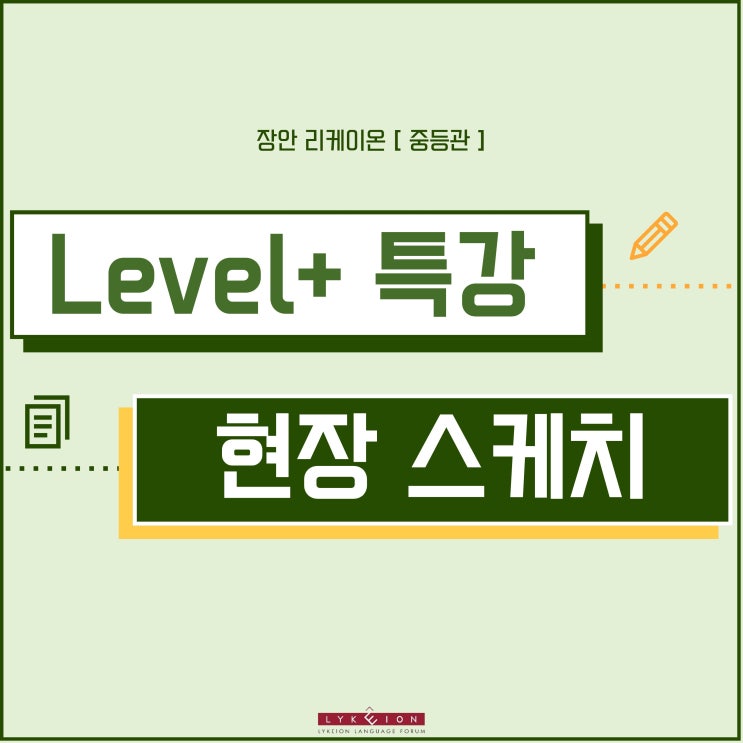 안녕하십니까. 리케이온 교육 장안 캠퍼스입니다. 1월 18일(일), 중등관에서는 다가오는 텀테스트(Term Test)를 대비하여 Level+ 특강을 진행하였습니다. 시험을 앞둔 시기인 만큼, 이번 특강은 단순한 문제 풀이에 그치지 않고 학생들이 자신의 실력을 점검하고, 실제 시험 상황에 대비할 수 있도록 돕는 시간으로 구성되었습니다. 아이들은 집중도 높은 분위기 속에서 마지막 점검과 실전 감각을 다지는 의미 있는 하루를 보냈습니다. 새 학기의 출발선, TERM TEST란? 텀테스트는 3월부터 5월까지 진행되는 봄학기 과정의 레벨 편성 평가로, 학생들의 영어 학습 성취도와 이해도를 종합적으로 점검하기 위한 시험입니다. 아이들의 영어 실력을....... <img src="https://blogthumb.pstatic.net/MjAyNjAxMTlfMTcz/MDAxNzY4ODA0NTAwNDYz.oCkEITxul6uOr9XWZ0ccBmEg0Y-7nhKJc7dlUYFvAJ4g.egK8RuyXub2ARWZ6HDwzWZyDJYsWpyrkU8_X9UJ3srgg.JPEG/%C1%DF%B5%EE_%B7%B9%BA%A7_%C1%F7%C6%AF.jpg?type=s3" />