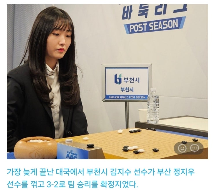 안녕하세요~ 수원 매교동 인계동 어린이 바둑전문교육기관 지니어스 바둑입니다^^ 그동안 우리 아이들의 기쁜 입상 소식을 자주 전해드렸는데요. 오늘은 조금 특별하게, 아이들의 롤모델이자 스승인 저의 생방송 대회 출전 승리 소식을 전해드리려고 합니다! 매년 아마추어 바둑인들의 꿈의 무대이자, 전국 최고의 엘리트 선수들이 모이는 'KBF 바둑리그'가 열립니다. 저는 2025년에도 어김없이 6년 연속 부천시 팀의 대표 선수로 출전하게 되었습니다. 4개월간 지역 투어로 치열한 승부 끝에 거둔 정규리그 개인 성적 6승 2패! 전국 최정상급 실력자들 사이에서 거둔 이 값진 성적으로 소속팀 '부천시'를 리그 4위에 안착시....... <img src="https://blogthumb.pstatic.net/MjAyNjAxMjFfMjcw/MDAxNzY4OTI0NDIyNzg2.Iqrcs9pwQu6OS1DHwWeTT0oCKTch5r8rh2Mxdm1PB7Ug.u_JtwIQp_T_Q-BxMIhzqvyG_P8GnVF67xL9vVb1ftj0g.JPEG/900%A3%DF1768922429508.jpg?type=s3" />