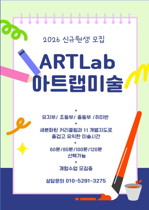 안녕하세요, 아트랩 미술입니다. 2026 신규원생을 모집합니다. 저희 아트랩미술은 탄탄한 실기력을 바탕으로 아이들의 창의성과 상상력을 이끌어내는 미술수업을 하고있습니다. 단순히 퍼포먼스 수업이나 기법위주, 흥미위주의 미술 수업은 단기간의 흥미를 이끌어 낼수는 있지만 근본적인 미술실력, 즉 실기력과 함께 병행 되어야만 아이들의 생각과 상상력을 스스로 그려내고 나타낼수 있습니다. 아이들의 부족한 부분은 저마다 다르고 삶의 속도 또한 다르기 때문에 적은 인원의 수업을 통해 아이들의 부족한 부분을 채우면서 즐겁게 수업하고 있습니다. 즐겁고 차근히 배워나가는 미술수업이 되도록 매시간 준비하고 있습니다. 자세한 수업내....... <img src="https://blogthumb.pstatic.net/MjAyNjA0MDJfMTIz/MDAxNzc1MTAxNTAxMDY0.DL00JfbE-5ATVf1ce_90yoQ7bLatWHQ4O35O7foZtdUg.NXEwIvzKI84J2Qr0SPERsAXOIpEIoI6WZjGJw7qQsDAg.PNG/%C8%AD%B8%E9_%C4%B8%C3%B3_2026-04-02_122145.png?type=s3" />