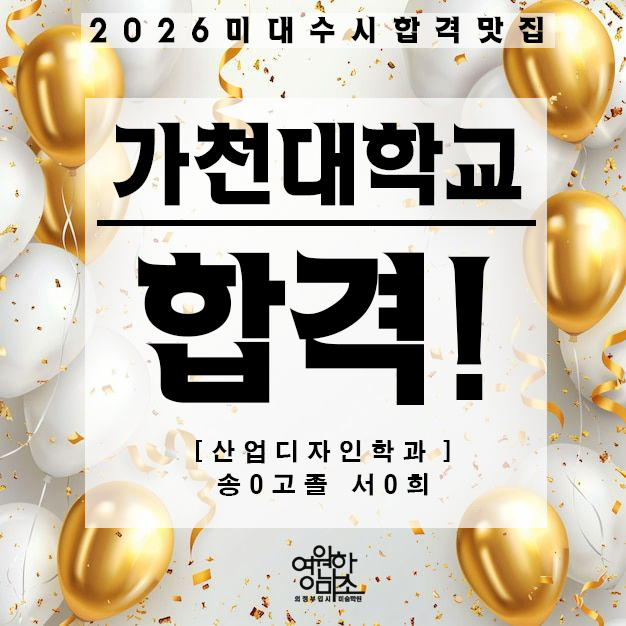 안녕하세요~! 미대입시 수시 합격맛집!! 의정부 대표 입시미술학원 영원한미소입니다^^ 오늘은 2026학년도 수시 합격 학교 가천대학교(가천대) 산업디자인과 합격생이 나왔습니다 >_< 합격을 축하합니다!!!! 송 현 고 졸 서 0 희 역시 미대입시 전형만 알아도 대학이 높아진다!! 에 대해 의정부 입시 미술학원 영원한미소에서 알려드리는 꿀팁!! 수시 입시 정보로 가천대학교 수시 합격에 대해 알아보도록 하겠습니다!! 여러분도 미대에 가고 싶은가요?!! 그럼 영원한미소 미술학원(의정부)로 입시 상담오세요! 자세한 이야기를 진행해 보겠습니다!! [ 2026 가천대학교 산업디자인과 합격증 ] 역시~! 의정부 영원한미소!! 합격자 발표는&qu....... <img src="https://blogthumb.pstatic.net/MjAyNjAyMDNfNDkg/MDAxNzcwMTAzMTEyNTMx.St12mQcB70jPvmPvilmZfJ94fEd1FvX97Kc_F5XFAxMg.-v85WbdQHbH3qcNSHrL_UvVSW0Wi2PtLKGBbxisvOl8g.JPEG/9%C0%C7%C1%A4%BA%CE%BF%B5%BF%F8%C7%D1%B9%CC%BC%D2%B9%CC%BC%FA%C7%D0%BF%F8%B0%A1%C3%B5%B4%EB%C7%D5%B0%DD%BC%AD%C0%E7%C8%F1.jpg?type=s3" />