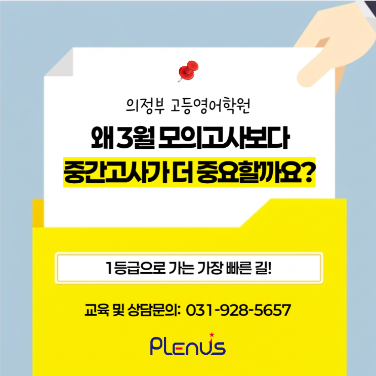 안녕하세요! 희망의 또 다른 이름 PLENUS ENGLISH 의정부 호원동 영어학원 플래너스입니다! 오늘은 3월 모의고사 이후 학습 방향 설정에 고민이 많으신 분들을 위해 중간고사 대비의 중요성과 효율적인 학습 전략에 대한 내용을 전해드리려고 합니다! 단순히 점수에 일희일비하기보다는 실제 내신 결과로 이어지는 실질적인 준비 과정이 그 어느 때보다 중요한 시기입니다! 1. 3월 모의고사 이후, 왜 중간고사가 더 중요할까요? 고등 영어에서 3월 모의고사는 현재의 객관적인 실력을 점검하는 지표가 되어줍니다! 하지만 대입에 직결되는 중간고사는 학교별 시험 범위와 교과서, 부교재, 그리고 까다로운 서술형 비중까지 모두 반영됩니다! ....... <img src="https://blogthumb.pstatic.net/MjAyNjA0MDNfMjQx/MDAxNzc1MTc0MzQxNjEx.qMBHQlyE7WLOAdrIT8OIPzXLP91NQFhvGetsaJLkhgcg.kgO4VjzW9mQBsaTAFDykQ1G5lGU96lLPtLjI01-7K1gg.PNG/%C8%A3%BF%F8%B5%BF_%BF%B5%BE%EE%C7%D0%BF%F8-001_%281%29.png?type=s3" />