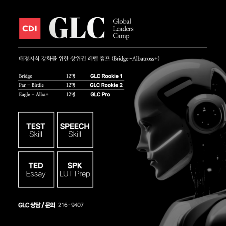 Global Leaders Camp GLC 7기 사전모집 GLC (Global Leaders Camp)란? GLC 7기만의 압도적인 커리큘럼 • 100% 원어민 강사진 완벽한 몰입 환경에서 최고 수준의 강사진과 함께합니다. • 영어 뉴스 기반 Presentation 시사 이슈를 다루며 논리적인 말하기 실력을 기릅니다. • TED 활용 배경지식 강화 다양한 분야의 TED 강연을 통해 지식의 폭을 넓히고 심도 있는 에세이를 작성합니다. • 정기평가 완벽 대비 TOEFL Junior, TOEFL (R/W) 득점력을 끌어올리고, 정기평가고사 스피킹(Spk Prep)까지 확실하게 준비합니다. 레벨별 맞춤 소수정예 클래스 효율적인 밀착 관리를 위해 각 클래스는 단 12명 정원으로 진행됩니다. GLC Rookie....... <img src="https://blogthumb.pstatic.net/MjAyNjA0MDNfNDUg/MDAxNzc1MjIzNTA2MTI2.O6nCmXuA5uJtLIa7pk4eBHH9tSQ5To1Zun22obt9nfMg.3AXB9zmApZjh6clput8X1QQ_jmxKdC3XPpstFZxutXIg.PNG/IMG%A3%DF6249.PNG?type=s3" />