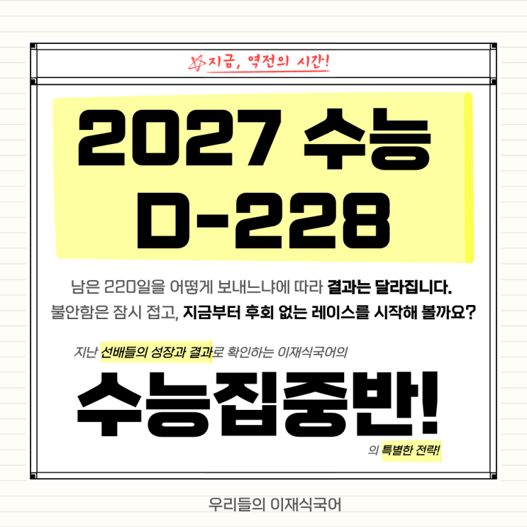 고3 수능 D-228 지금부터는 ‘실전 중심 학습’입니다. 안녕하세요:) 입시 전문 국어학원, 우리들의 이재식국어입니다. 수능까지 얼마 남지 않은 이 시기, 우리 학생들은 국어 학습의 방향을 어떻게 잡아야 하는지 제대로 이해하고 있을까요? 고3의 수능 국어는 이전과는 다른 훈련이 필요합니다. 오늘은 그 훈련 방법을 안내드리겠습니다. 왜, 고3 국어는 달라져야 할까요? 중등부터 고등 2학년 초반까지는 ✔ 개념 이해 ✔ 작품 학습 ✔ 문제 경험 을 중점으로 학습해왔다면 고3은 ✔시간 안에서 해결하는 능력 ✔출제 의도를 빠르게 파악하는 능력 이 가장 중요해집니다. 그렇다면 자연스럽게 이 능력을 어떤 계기로, 어떻게 키울 수 있을까? ....... <img src="https://blogthumb.pstatic.net/MjAyNjAzMjlfMjMx/MDAxNzc0NzcwMjg5ODQ0.j2Cc7nK_dJPWeGASth1F78vppHK7c_U4Qpg1lmHQFtYg.ffquwVVhhWI6h74R3rwuly3Sl3qpjGNTjDtnBn0hXbgg.PNG/%BB%F3%B5%BF%294%BF%F9%BC%F6%B4%C9%C1%FD%C1%DF%B9%DD%BE%C8%B3%BB_26.03_%C3%D6%BA%B8%C0%BA.png?type=s3" />