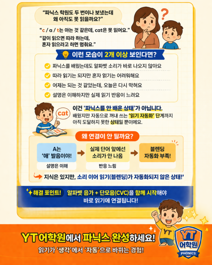 가장 많은 초등 어머니들께서 첫 방문때 하시는 질문입니다. 영유도 다녔고... 타원에서 파닉스를 했는데., 아이가 못 읽어요.., 그래서 생각해 보았습니다 1️⃣ 파닉스를 배웠는데도 왜 아직 읽지 못할까요? “파닉스 수업을 여러 번 들었는데도 알파벳 소리가 바로 안 나와요.” “c / a / t는 아는 것 같은데, cat을 읽으라고 하면 막혀요.” “같이 읽으면 따라 하는데, 혼자 읽으라고 하면 멈춰요.” 이런 모습, 혹시 익숙하신가요? 아래 항목 중 2개 이상 해당된다면 지금은 진도를 나가기보다 기초 연결을 다시 만드는 단계가 필요합니다. 파닉스를 배웠지만 알파벳 소리가 즉각적으로 나오지 않는다 따라 읽기는 되지만 혼자 읽기는 어....... <img src="https://blogthumb.pstatic.net/MjAyNjAzMjZfMjEg/MDAxNzc0NDgyODQ1NDU5.GMmE3NUVeMmbU2C3qpCfbHHLk7bI0BEnIDBDJhSjaPAg.LiMAXFa_c7DAFKQYj7rl1W9JKYBAG9zLwQU1sNJ4heUg.PNG/900%A3%DFfile%A3%DF0000000034c07206b08d5581331a9de1.png?type=s3" />