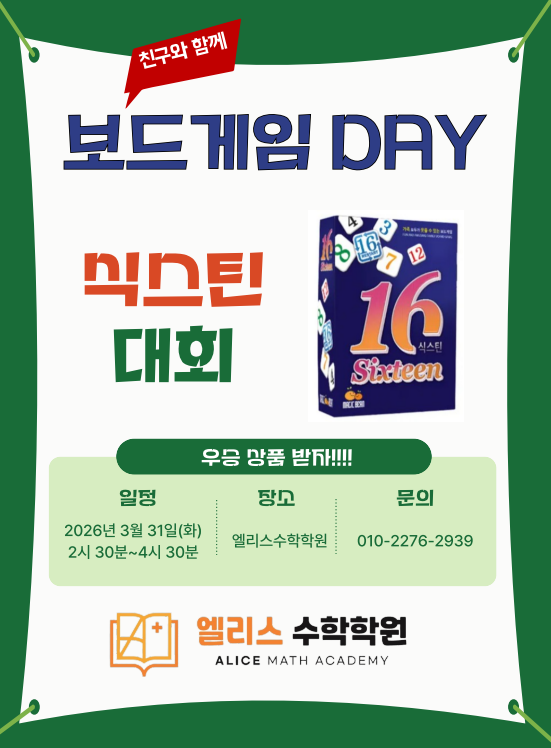 2026년 3월 보드게임데이 개최합니다. 매번 언제하냐고 묻던 행사를 3달에 한번 오픈합니다. 이번 보드게임데이의 종목은 식스틴~ 선택정렬 오름차순~ 승리를 위한 전략. 수리력 판단력을 요구하는 식스틴을 만나봅니다. 3등까지 선물이 준비되어있어요 화이팅!!!! #엘리스수학학원 #보드게임데이 #식스틴 #수리보드게임 <img src="https://blogthumb.pstatic.net/MjAyNjAzMjhfMjc5/MDAxNzc0NjY4NzkyNjc0.f_k4Nr_pPAHrwY2vAxCC98A4bNITWDE3pe5qHrJOPOMg.P55HXbFcL4Tk1_AbP-lN0fa81tSY9rkxw21lZVStDfEg.PNG/1774668723818.png?type=s3" />