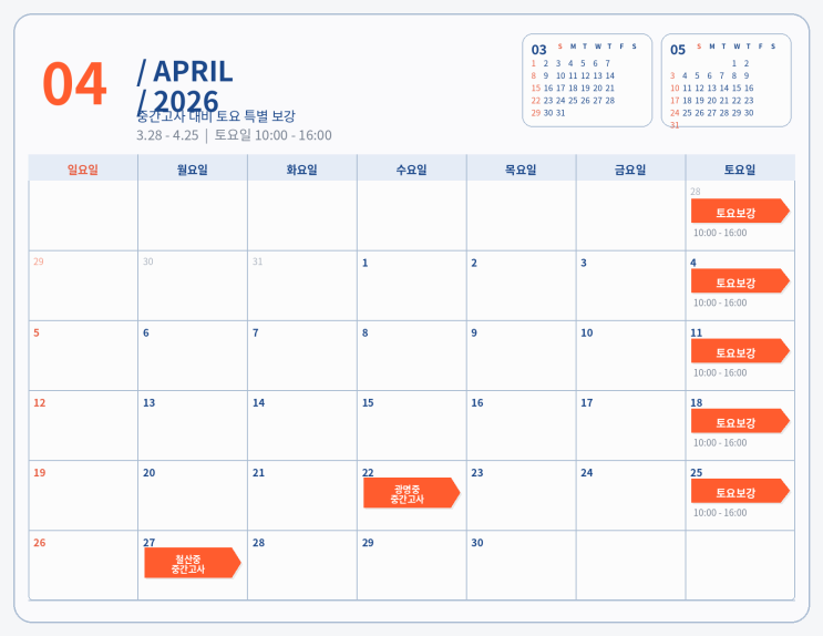 안녕하세요. 루트수학학원입니다. 다가오는 중간고사를 앞두고, 학생들이 시험을 조금 더 안정적으로 준비할 수 있도록 중·고등부 중간고사 대비 특별 보강을 진행합니다. 이번 특별 보강은 3월 28일부터 4월 25일까지, 토요일마다 오전 10시부터 오후 4시까지 운영되며, 시험 일정에 맞춰 총 4~5회 진행될 예정입니다. 현재 광명중학교는 4월 22일, 철산중학교는 4월 27일 수학 중간고사를 앞두고 있어 그에 맞춰 개념 정리부터 문제 풀이, 취약 유형 점검까지 시험 대비에 꼭 필요한 내용들을 집중적으로 보완할 예정입니다. 보강은 별도 추가 비용 없이 진행되며, 루트수학학원 학생들이 보다 탄탄하게 시험을 준비할 수 있도록 돕기 위해 마....... <img src="https://blogthumb.pstatic.net/MjAyNjAzMzBfMyAg/MDAxNzc0ODU0MzUxNTM4.Q1FHMh84XQJfk0zKgU7T4RqBYQ0P6A2T7xhpaoVz1kAg.JJ9al4F2peP2NSAtxdRQpxkSAPWqwEJxv58T8sufFnUg.PNG/root_math_april_2026_calendar_v2.png?type=s3" />