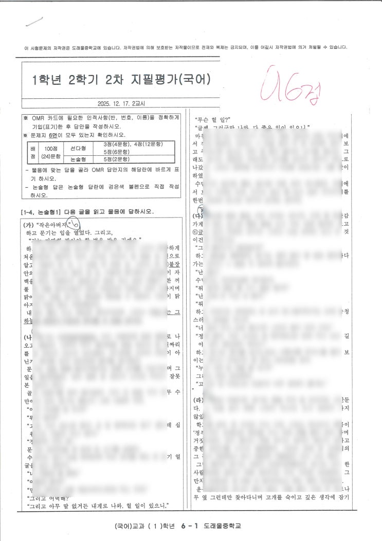 중1 국어 내신, 단순 암기만으로는 부족합니다. 실제 학교 시험에서 어떤 유형이 출제되고 있는지 면밀히 파악해야 효율적인 대비가 가능합니다. 2025학년도 도래울중학교 1학년 2학기 기말고사 분석을 통해 중학생 국어 내신의 방향성과 효과적인 학습법을 제시합니다. 도래울중 국어 시험, 어떤 특징이 있었나? ● 문항 구성 - 총 24문항 중 선다형 22문항, 논술형 2문항. 특히 5점짜리 문항이 8문항이나 포함되어 있어 고난도 문제의 비중이 높은 편입니다. ● 문학 영역 – 하늘은 맑건만 - 사건의 흐름, 어휘 의미, 내용 분석, 서술상 특징 등 문학 필수 유형을 두루 출제. - 특히 서술상의 특징 파악 문제는 서술자의 시점과 표현 방식을 이....... <img src="https://blogthumb.pstatic.net/MjAyNjAxMTlfNjMg/MDAxNzY4ODEyODcwNDA2.6iSf7-DAzvmIRSbJ8k6itxULtr8IfLlakzE2QJZQUkEg.Po7hPrLoicUyD_52YM7uJCFmyg0bK0WvlmfvPAKnNlUg.JPEG/20260119175013_00001.jpg?type=s3" />