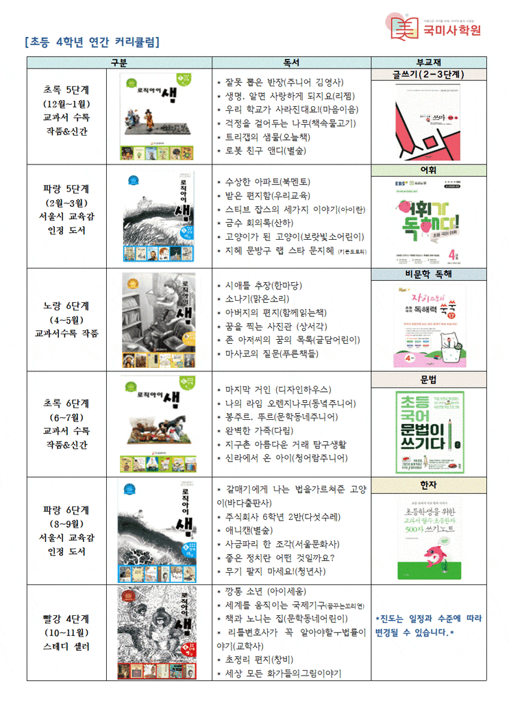 안녕하세요~ 초등 4학년 연간 교육과정 안내드립니다. 왜 초등부도 국미사 학원을 다녀야 하는지와 초등 수업이 궁금하시다면 아래 글을 꼭 읽어주세요~ https://m.blog.naver.com/hunka21/223613436731 https://m.blog.naver.com/hunka21/223808741442 식사동에 독서 학원이 예전에 비해 많이 생겼더라구요. 저희 초등 국미사 학원의 차별점은 ‘독서를 잃지 않되, 수능&내신 1등급‘에 안착할 수 있는 국어실력을 쌓도록 하는 겁니다. 그래서 ’독서‘만을 강조하지 않고, ’국어‘ 수업도 같이 진행하기에 초등 저학년 학부모님들께서는 학습적인 면이 강조되는 걸 꺼리시는 분도 있으십니다. 하지만 학생에 따라 받아들이는 게 다르고, 또....... <img src="https://blogthumb.pstatic.net/MjAyNjAzMzFfMjI2/MDAxNzc0OTI2MTUwNTIx.0yGuFySR0pvKmifFw2VR_wRxUDTh0uDrmSXlwlgM9SEg.D84BwJOtfiW2QR28O5BdpKYPFVpIbbEHPslYFQVG8jcg.GIF/IMG%A3%DF4271.GIF?type=s3" />